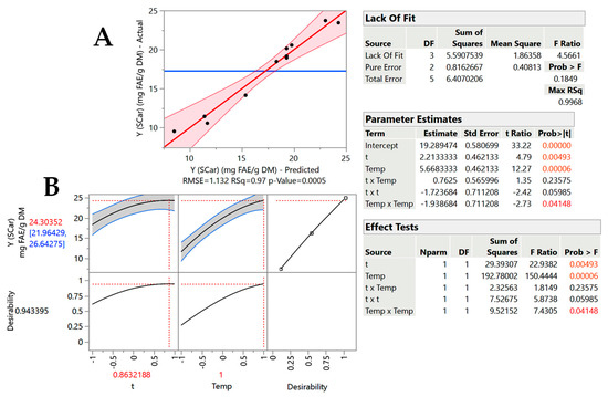 Statistical information derived from deploying response surface methodology for optimizing t and T conditions for WB treatment with the DES GL-SCar. Graph (A) presents the correlation between actual and predicted YTP values, while graph (B) illustrates the desirability function, through which optimum t and T levels could be predicted. The inset tables provide the results from the ANOVA and lack-of-fit tests. Values in color are statistically significant (p < 0.05).
