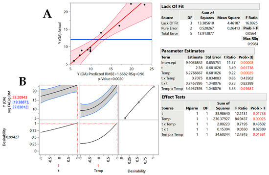Statistical information derived from deploying response surface methodology for optimizing t and T conditions for WB treatment with the DES GL-OA. Graph (A) presents the correlation between actual and predicted YTP values, while graph (B) illustrates the desirability function, through which optimum t and T levels could be predicted. The inset tables provide the results from the ANOVA and lack-of-fit tests. Values in color are statistically significant (p < 0.05).