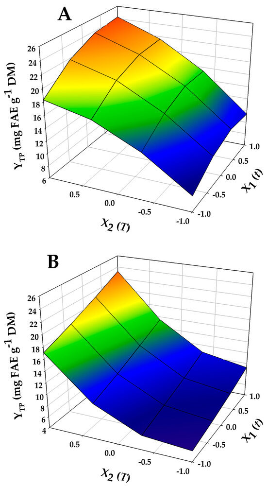 It can be seen in Figure 2A and Figure 3A that both models had an R2 equal to or higher than 0.96, and, based on a confidence interval of at least 95%, the lack-of-fit p-values were highly significant. Thus, both models showed very good adjustment to the actual (experimental) values. Using the models, 3D diagrams were constructed to visually illustrate the effect of treatment variables on YTP, and present an at-a-glance comparison between the two DESs (Figure 4).