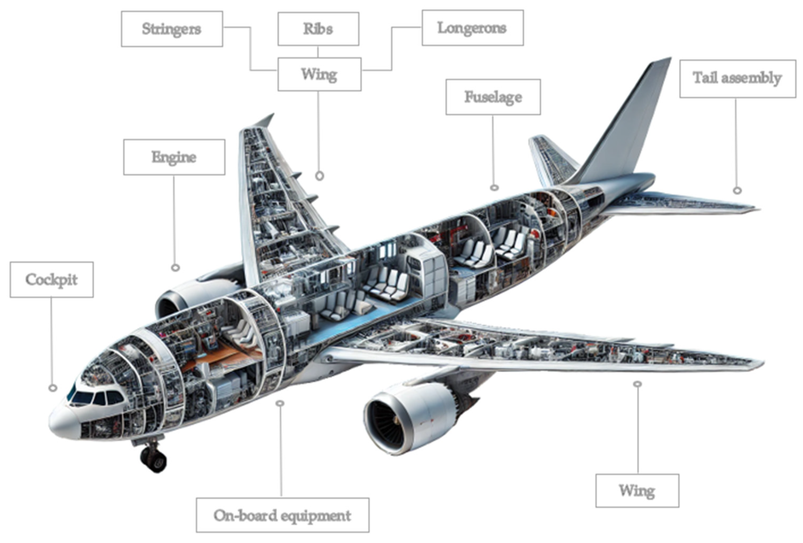 - Pierobon, M. Under Construction: Composite Materials Replace Traditional Aircraft Materials. Available online: https://www.aviationbusinessnews.com/cabin/composite-materials-aircraft/ (accessed on 25 November 2024).