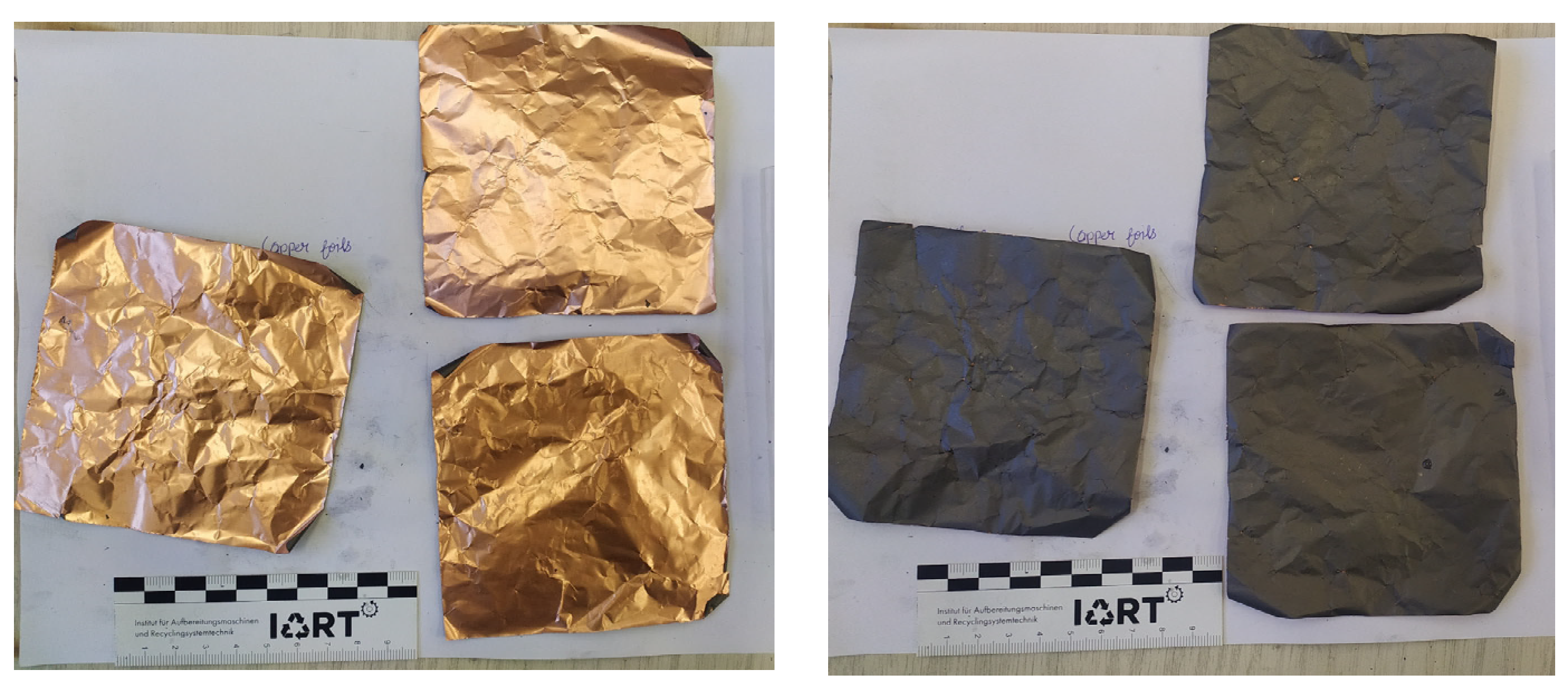 - Wiechers, P.; Hermann, A.; Koob, S.; Glaum, F.; Gleiß, M. Development of a Process for Direct Recycling of Negative Electrode Scrap from Lithium-Ion Battery Production on a Technical Scale and Its Influence on the Material Quality. Batteries 2024, 10, 218. [Google Scholar] [CrossRef]