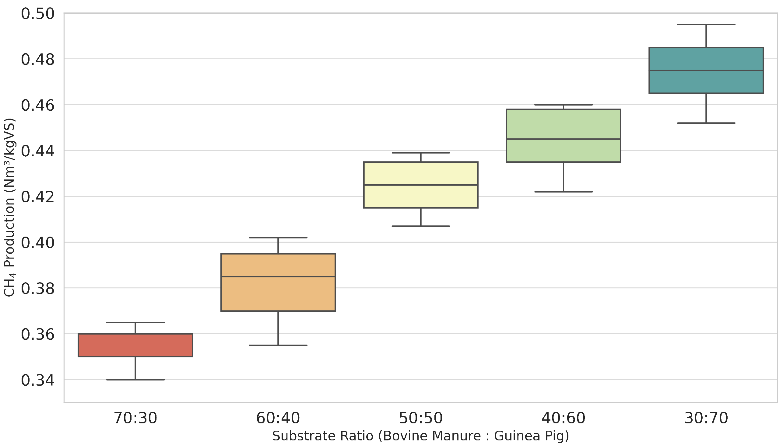 According to laboratory data, the C/N ratio of the 70:30 mixture is 22.1, while in the 30:70 mixture, it decreases to 20.8. Both proportions fall within the optimal range considered for anaerobic digestion (15–30); however, higher values within this range are associated with greater stability and a lower risk of ammonia inhibition, which is especially relevant when increasing the fraction of guinea pig manure richer in nitrogen.