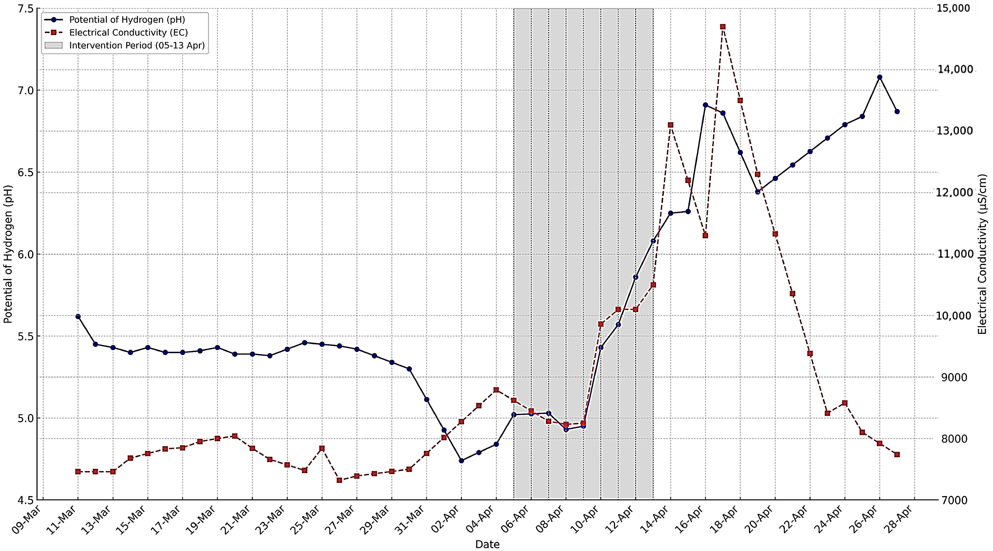 Figure 4 shows a sustained pH decrease below 5.0, accompanied by low and stable EC, reflecting an accelerated acidogenesis scenario in which the accumulation of volatile fatty acids exceeds the buffering capacity of the system, generating a strongly inhibitory environment for methanogenesis. The strategic intervention, indicated in the shaded area (April 5–13) through controlled addition of NaHCO