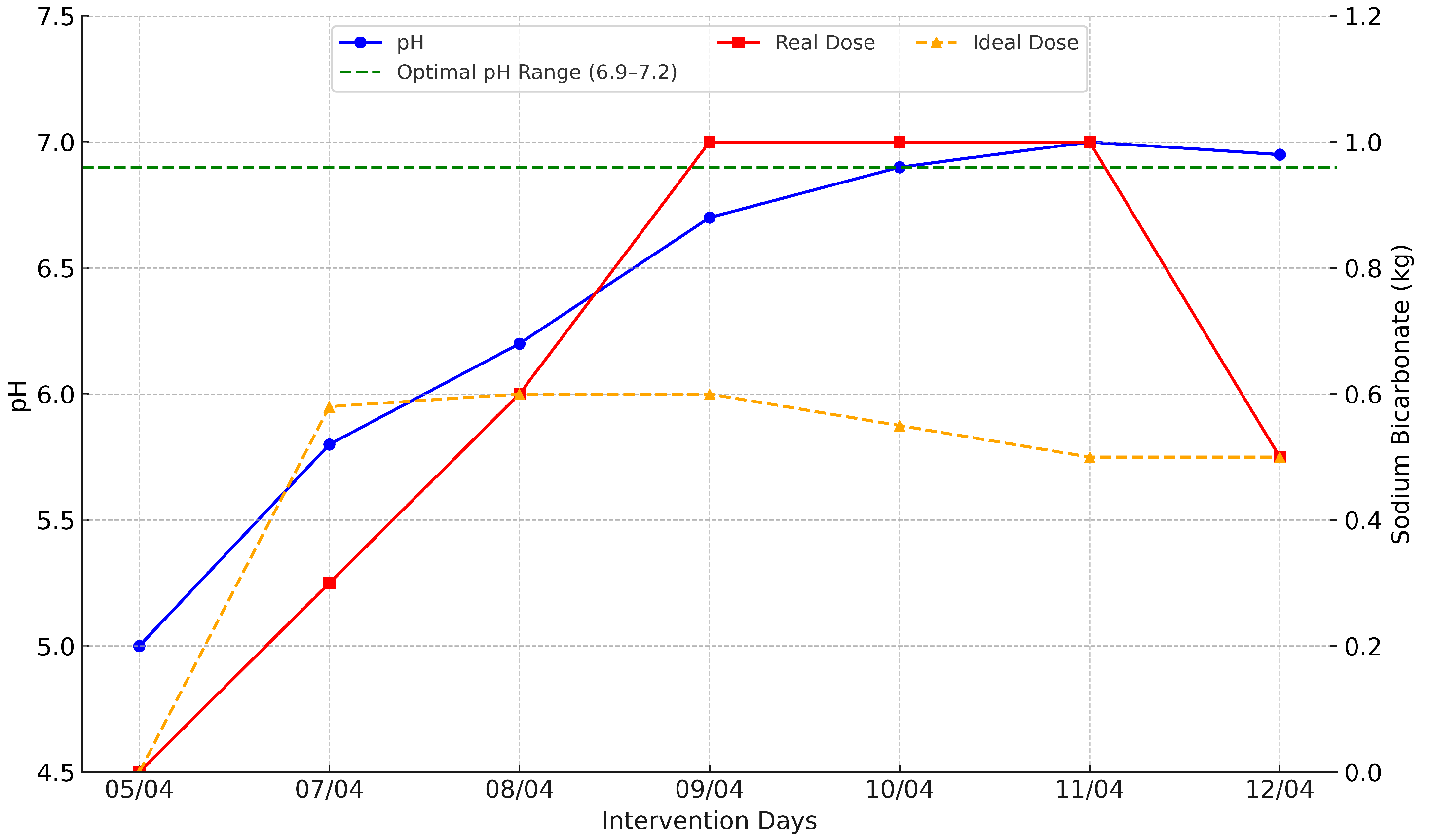 This produced an exponential rise in pH, reaching the optimal range (6.9–7.0) in just 96 h, significantly faster than the standard rate reported in the literature (5–7 days with stoichiometric dosing).