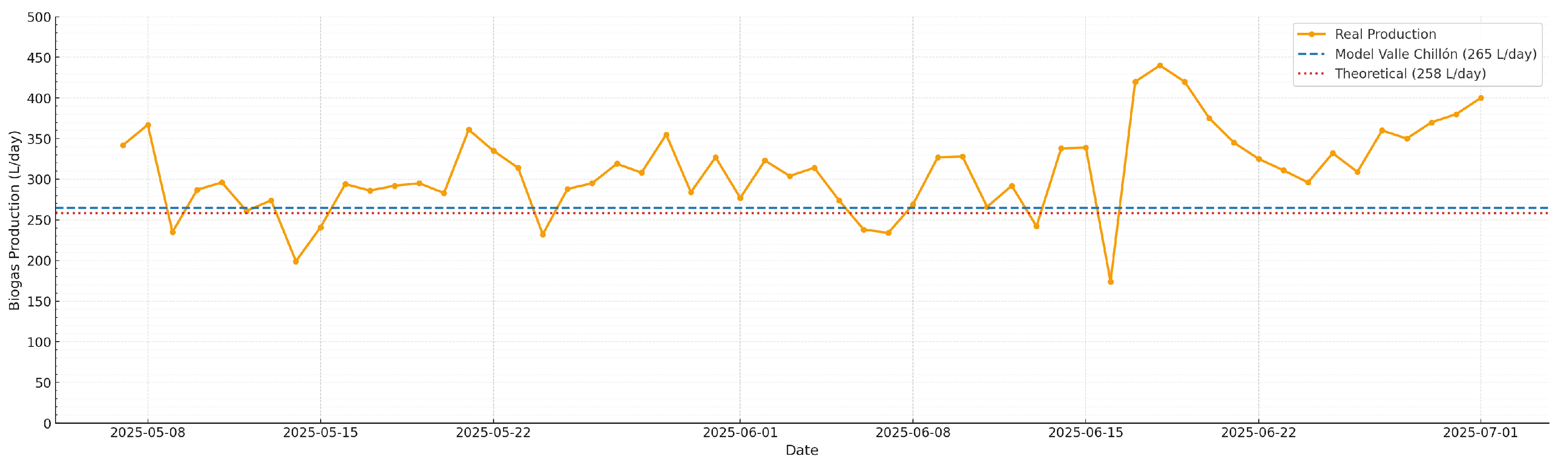 14], and the experimental values obtained in monodigestion and co-digestion systems. The temporal dynamics of daily methane production were analyzed as a function of substrate composition and operating conditions, with the aim of evaluating the degree of approximation to the estimated theoretical values. This analysis demonstrates the effectiveness of the operational strategies applied and clarifies the influence of substrate type and critical parameter management on the actual performance of rural-scale biodigesters.