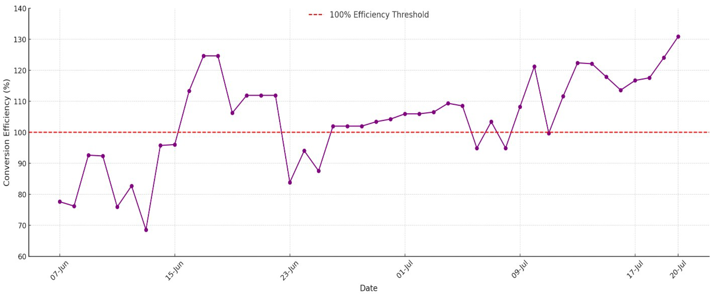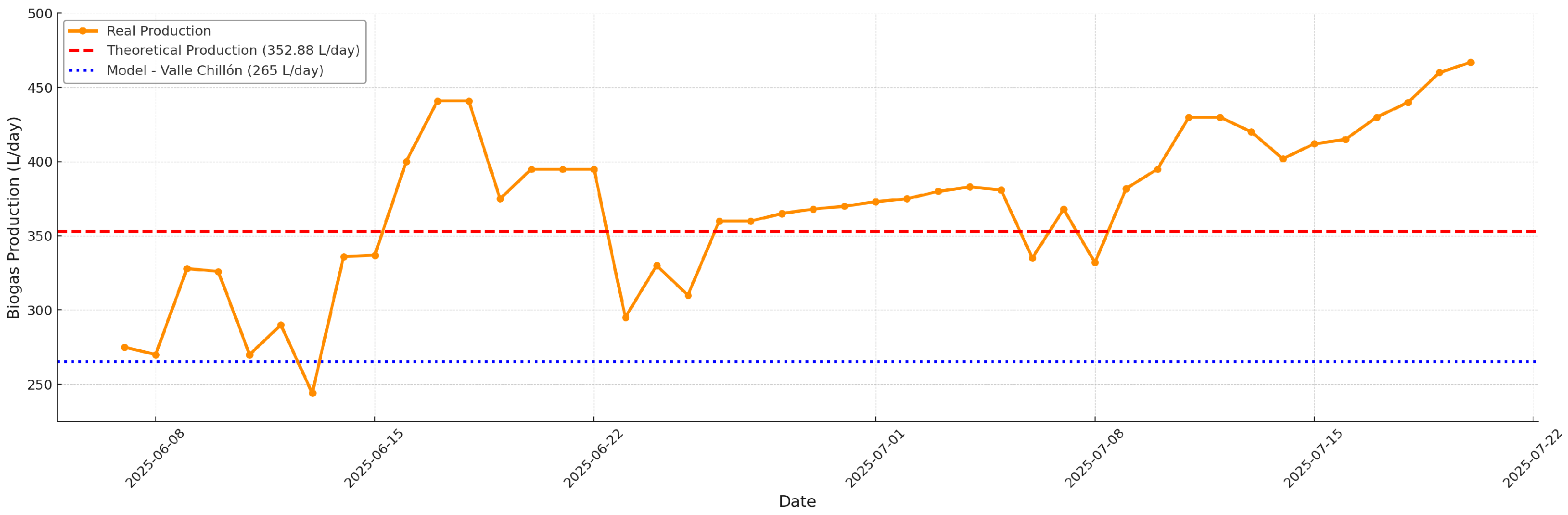 However, the actual observed production exceeded this theoretical estimate on multiple occasions, reaching a maximum value of 462 L/day, which represents an increase of 30.96% compared to the ideal theoretical production. This, initially counterintuitive, phenomenon is explained by the synergy of two key operational strategies: