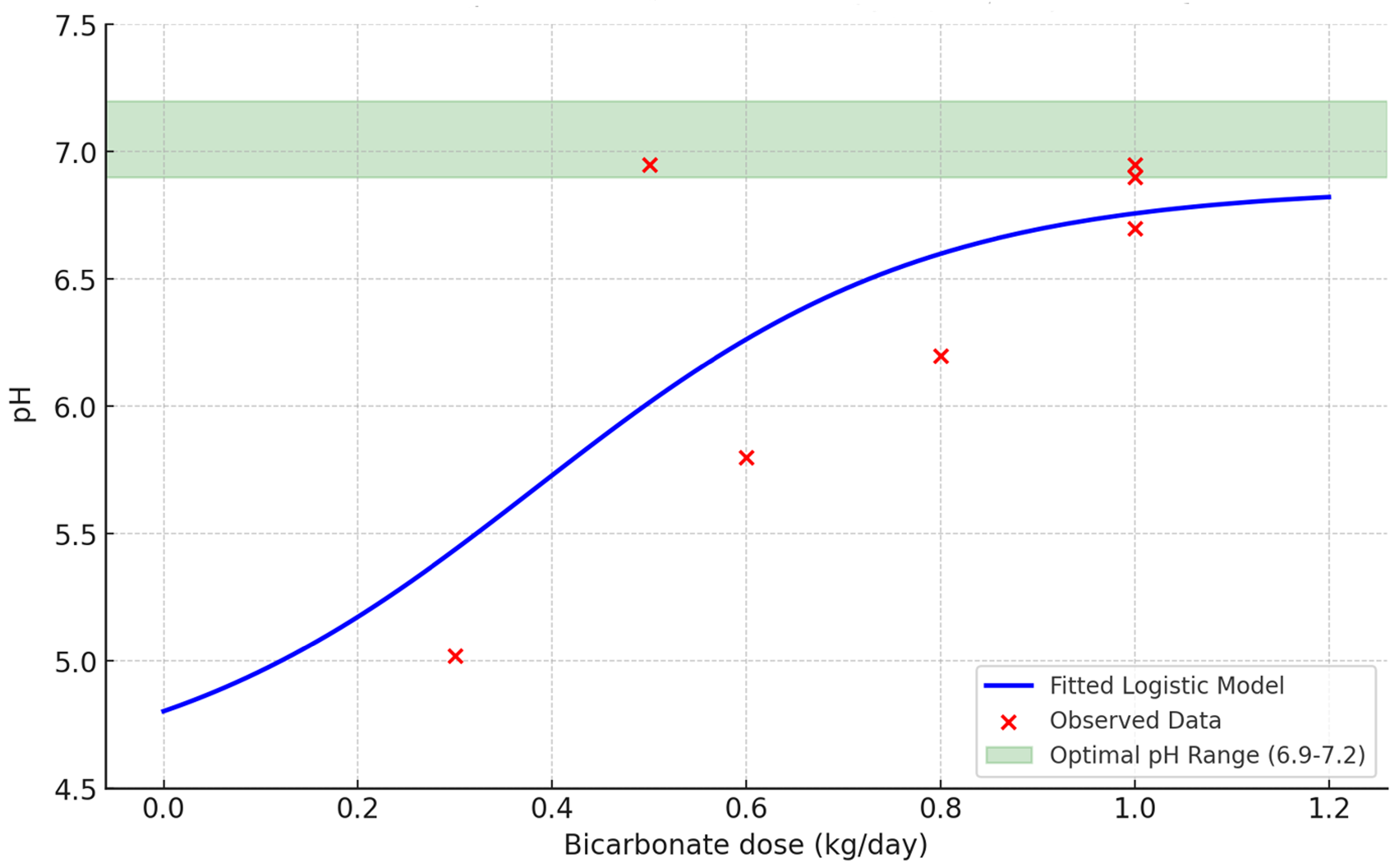 A dosing protocol based on a logistic dose–response curve was formalized with D = 0.38–0.40 kg/day, defining action thresholds, waiting times, and EC limits to avoid excessive osmolarity. The practical guidelines (sequential doses of 0.3–0.4 kg/day for 3–4 days when pH < 6.8 and EC is within a window) shorten recovery from VFAs shocks without penalizing the ionic environment of methanogenesis and translate acid–base/ionic balances into operable procedures.