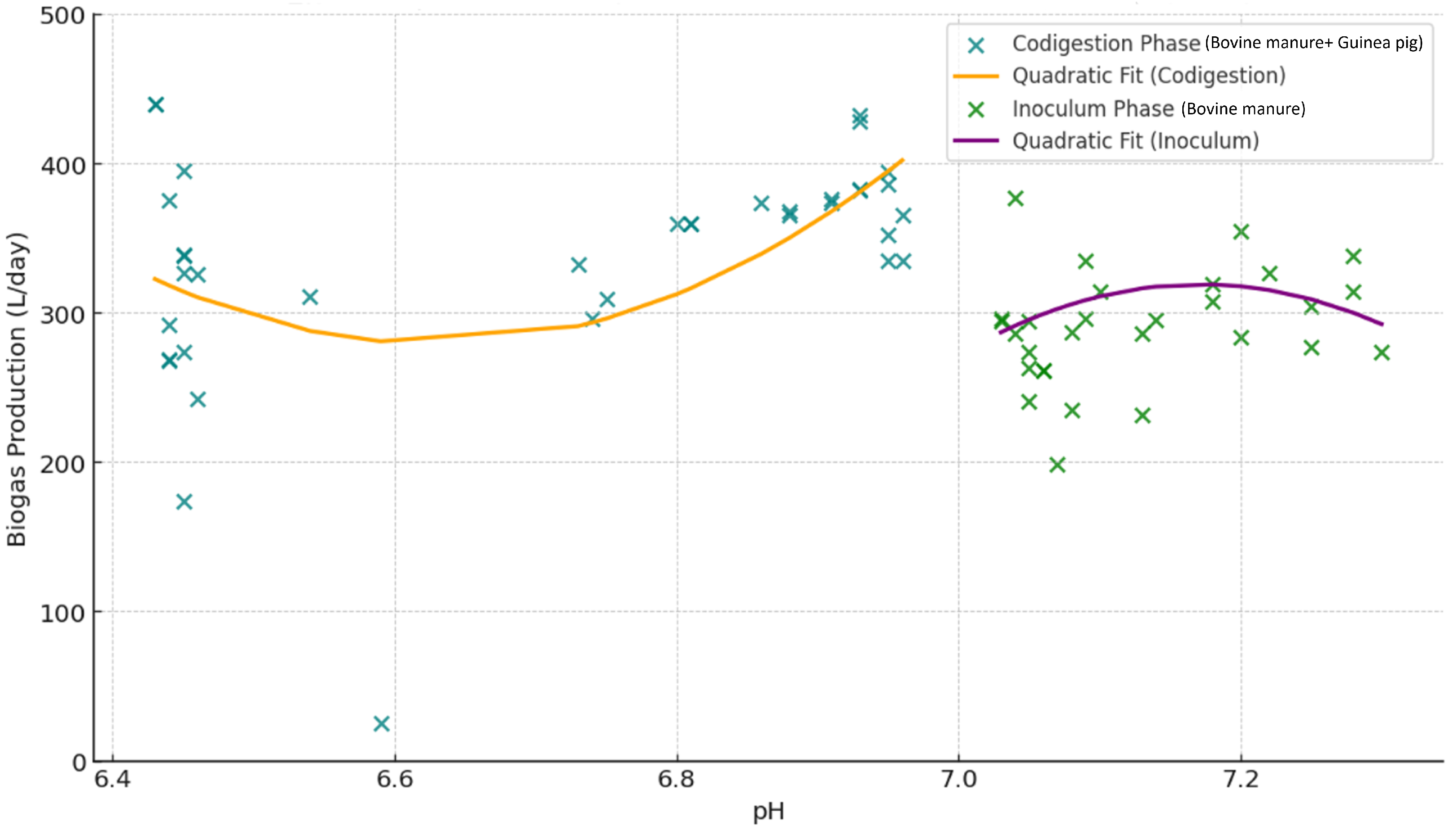 Table 5) was originally designed for the co-digestion of bovine manure and guinea pig manure, aiming to maximize energy yield and operational stability through the synergy between both substrates. However, as part of a deliberate and scientific operational strategy, the process was initiated by first establishing a robust microbial base through the monodigestion of bovine manure, which acted as the main inoculum for the biodigester startup.