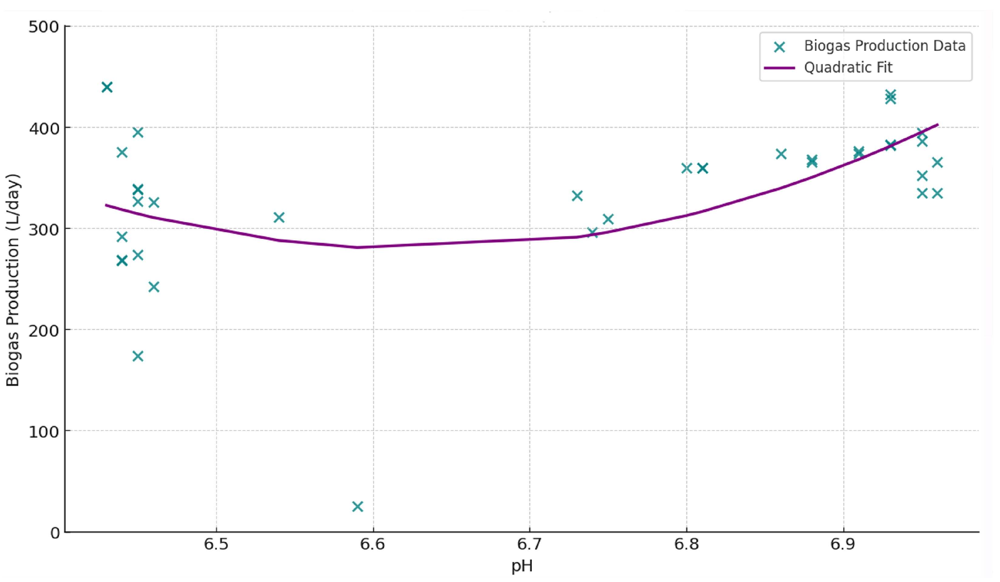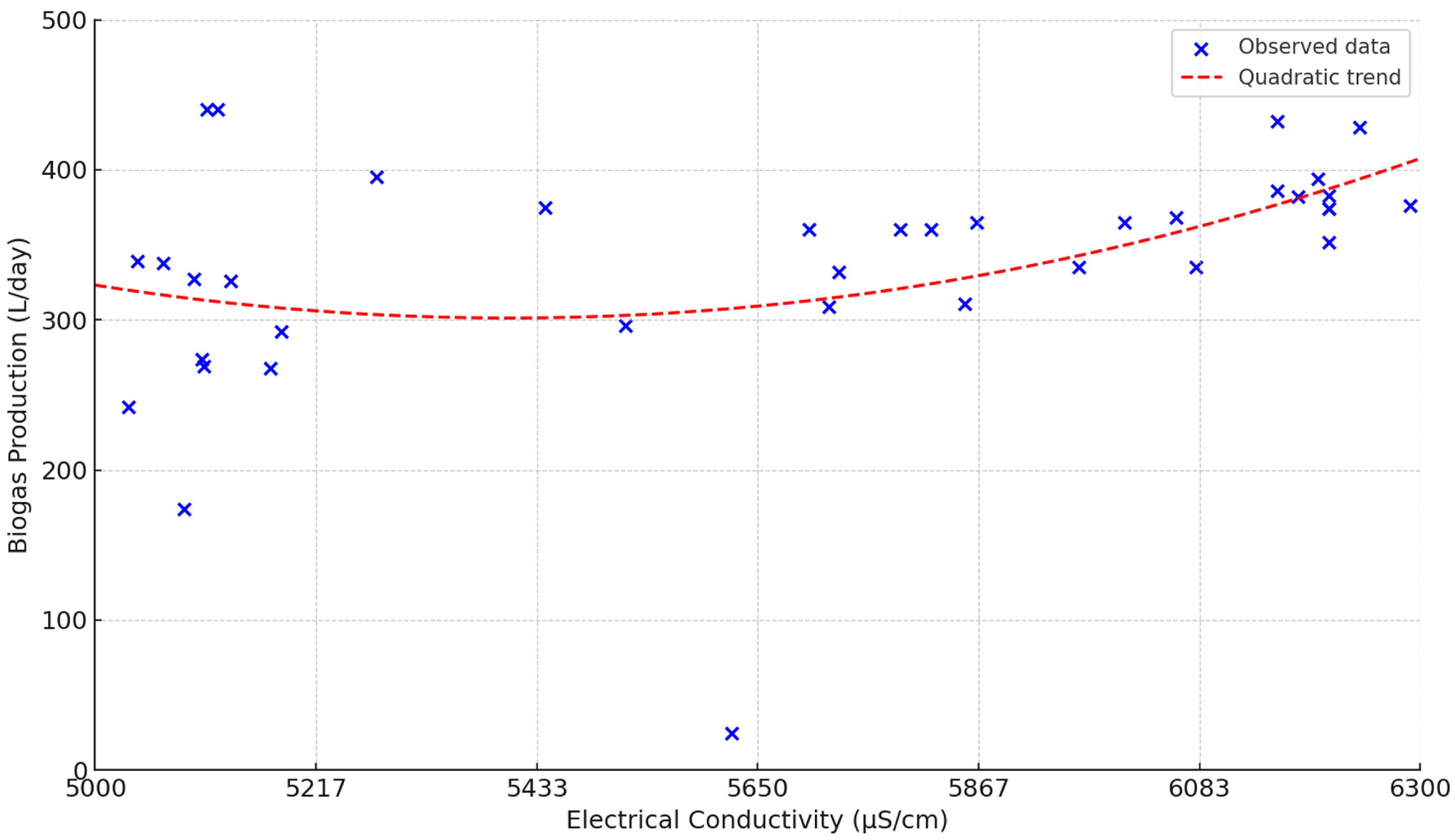 In previous studies, EC has often been omitted or treated as a secondary variable for several reasons. Primarily, the dominant literature has focused on well-established parameters such as pH, temperature, HRT, and OLR, which have historically been considered the main determinants of process stability and biogas production efficiency. EC, which reflects the ionic strength and buffering capacity of the medium, has received less attention because its mechanistic interpretation and control are more complex, especially in rural or small-scale systems where instrumentation for real-time measurement is limited.