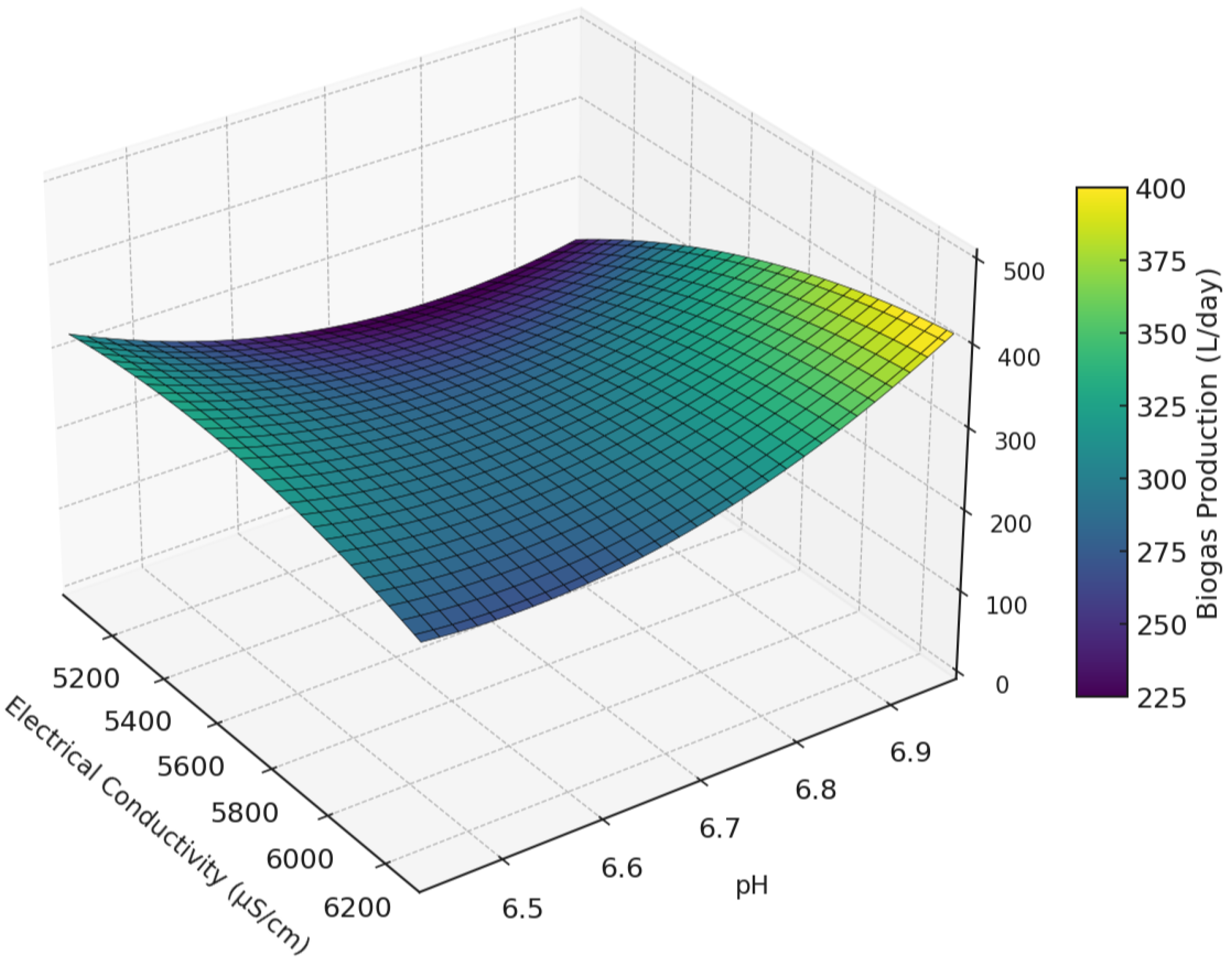 The surface presented here experimentally evidences that controlled increases in EC above 6000 µS/cm, combined with pH at the optimal threshold, generate an abrupt jump in biogas production, validating the intervention strategy based on bicarbonate addition. Thus, EC emerges as a first-order control variable, on par with pH, allowing buffering of substrate variability and maintaining microbial homeostasis under fluctuations of organic load, typical conditions in the field. Conversely, deviations below pH < 6.7 or EC < 5600 µS/cm lead to abrupt drops in production—more than 30%—due to acidification and lack of ionic cofactors, favoring methanogenic inhibition. The evidence also shows that excessively increasing EC or pH beyond the optimum does not improve production and may induce osmotic toxicity or ionic imbalance, evidencing the existence of strict operational windows.