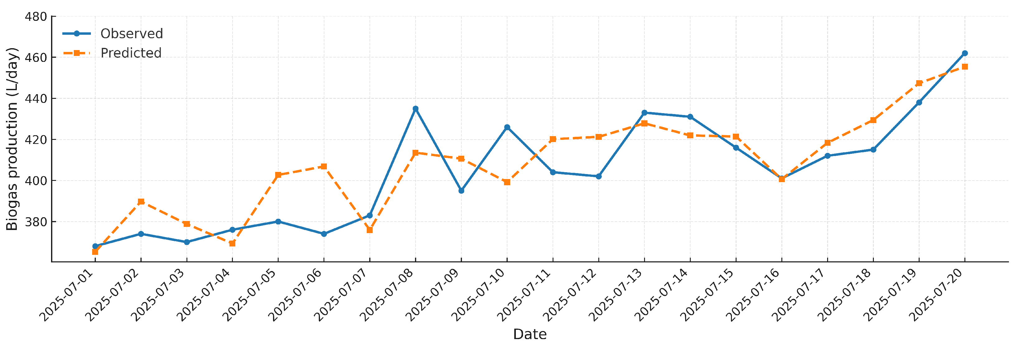 Figure 13 shows the comparative time series between the daily biogas production measured under real field conditions and the values predicted by the proposed mathematical model for the period from 1 July to 20 July 2025. This representation allows for a direct evaluation of the model’s predictive capability under real operational conditions.