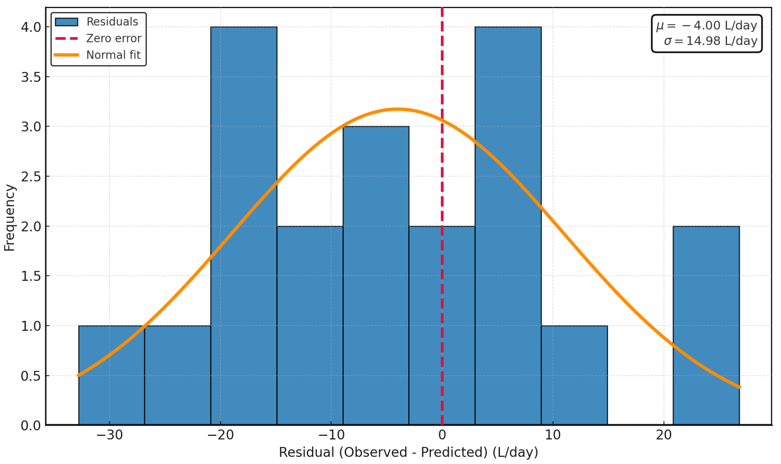 ), supporting the normality assumption. The slightly negative mean indicates a small over-prediction (about 4 L/d) that can be corrected by recalibrating the intercept. The overall accuracy is reflected in MAE = 11.2 L/d and RMSE = 13.8 L/d, which translates into a typical daily prediction band of