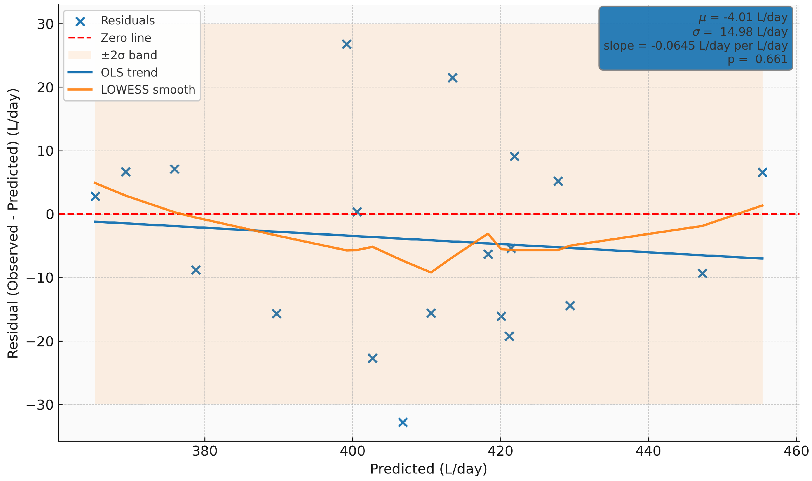 Neither the OLS line (non-significant slope, ) nor the LOWESS smoothing shows systematic trends, indicating that the model assumptions (independence, approximate normality, and homoscedasticity) are reasonably met within the operational range. As a minor improvement, the intercept could be adjusted to remove the average bias (4 L/d), and the few outliers associated with operational/measurement events could be reviewed.