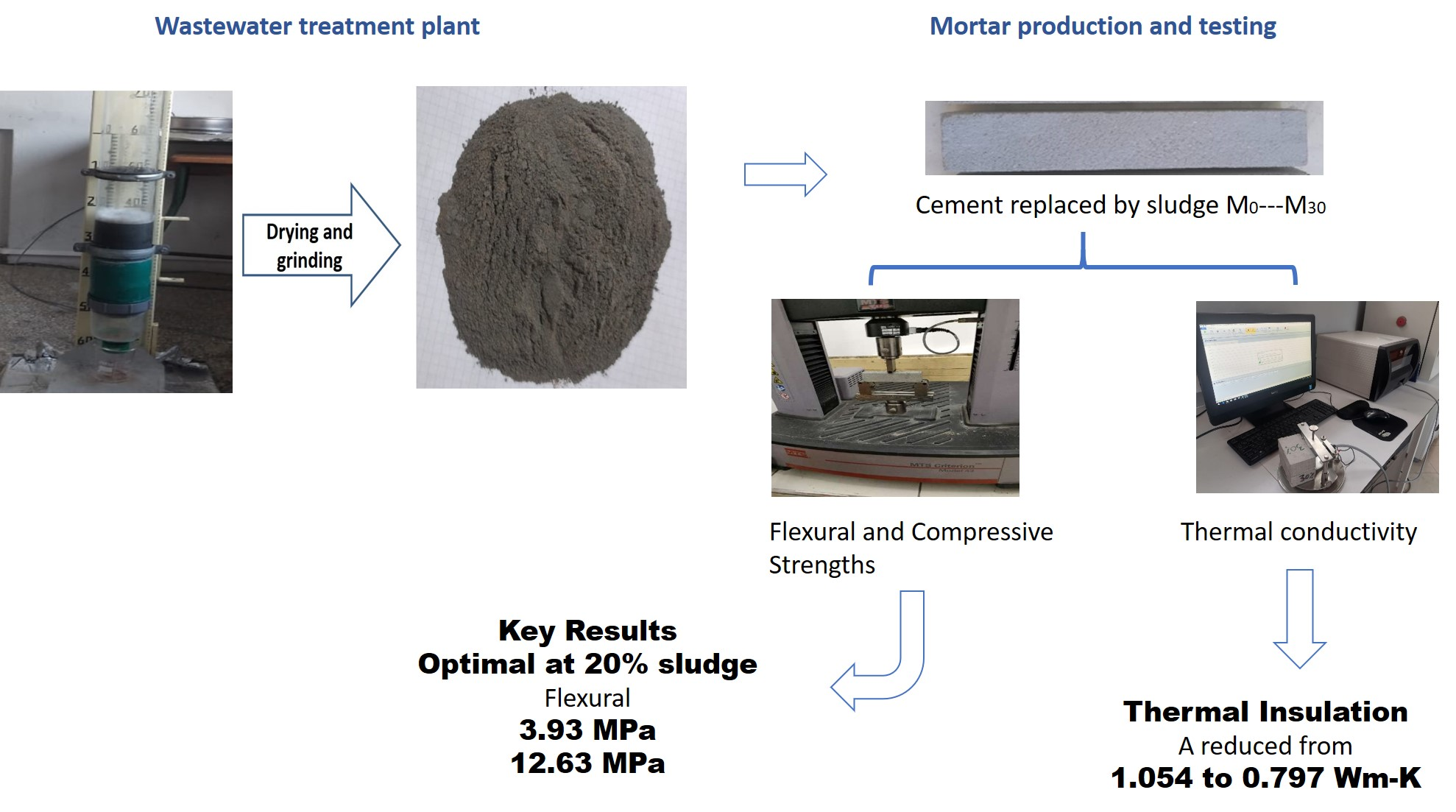 The following supporting information can be downloaded at: https://www.mdpi.com/article/10.3390/recycling10050192/s1, Figure S1. Wastewater sludge before and after drying and grinding; Figure S2. Flexural (a) and compressive strength tests (b); Figure S3. Particle size distribution of wastewater treatment sludge; Figure S4. X ray diffraction diagrams of hearth ashes and fly ashes; Figure S5. Infrared spectra of hearth ashes and fly ashes; Figure S6. Variation of thermal conductivity at ambient temperature as a function of sludge content; Figure S7. Thermal conductivity of mortar samples as a function of temperature; Table S1. Chemical composition of Portland cement (CPJ 45); Table S2. Physical characteristics of cement; Table S3. Chemical composition of sand souiria; Table S4. Formulation of Mortar Specimens Based on Sludge; Table S5. Chemical composition (in mass %) of the sludge; Table S6. Mineral phases identified in mortars with different percentages of sludge and standard PDF data.