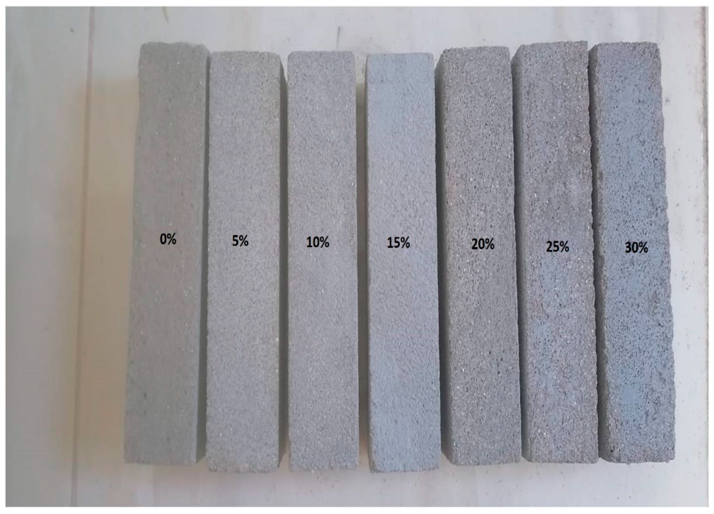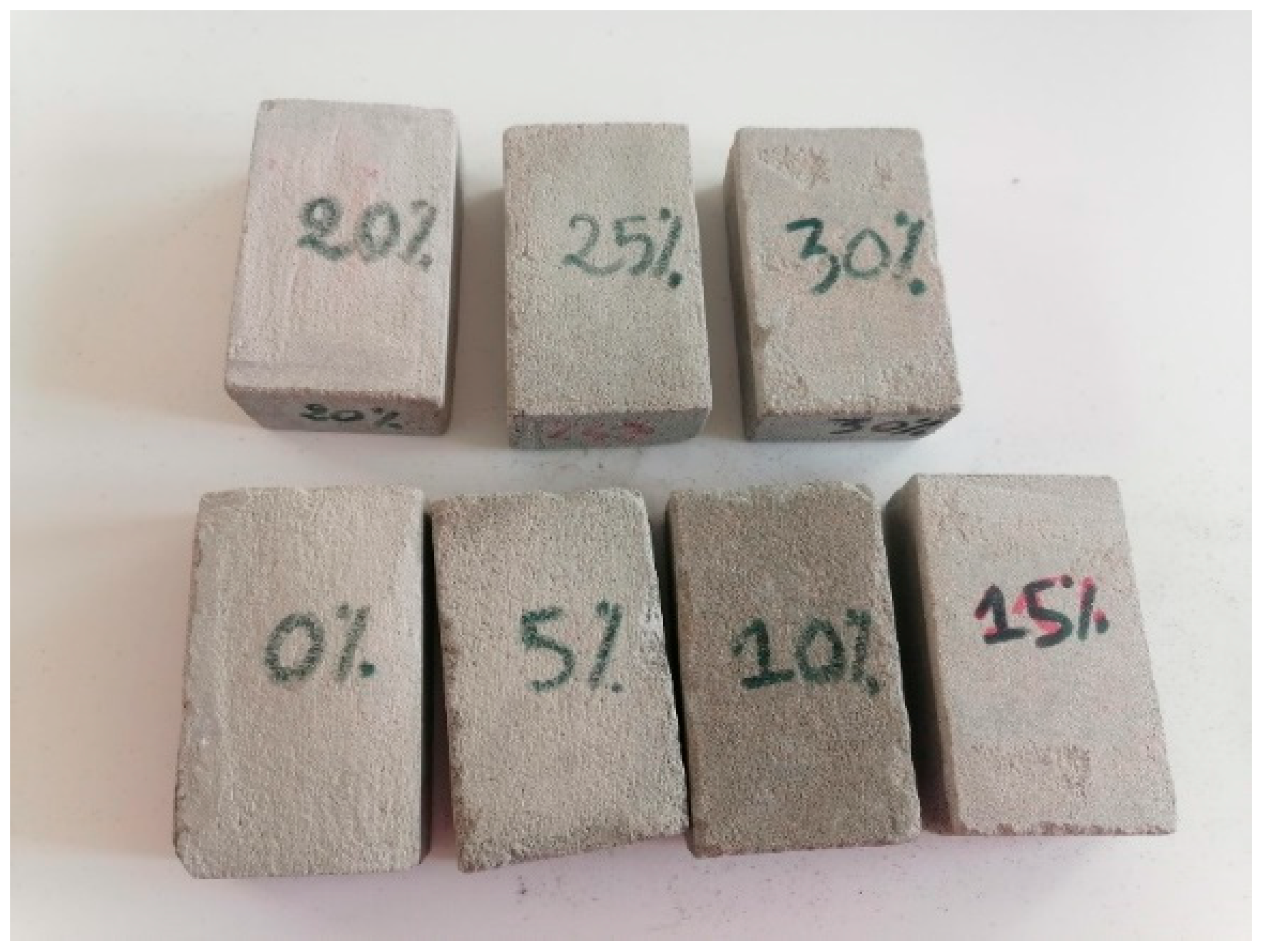 Seven samples were prepared using mortars in which cement was partially replaced by wastewater sludge from detergent manufacturing, in proportions of 0%, 5%, 10%, 15%, 20%, 25%, and 30%. This setup aimed to study the thermophysical properties and select the optimal building proportions, as shown in Figure 2. These samples are parallelepipeds with dimensions of 3.5 × 7 × 11 cm3. For precise measurement of thermal conductivity and thermal diffusivity in low-conductivity materials, the sample thickness typically ranges from 20 to 40 mm and should ideally not be smaller than the radius of the hot disk sensor [26]. All the samples were demolded after 24 h and then air-dried in the laboratory for 28 days. The results presented were obtained by calculating the average of the results from the different analyses.