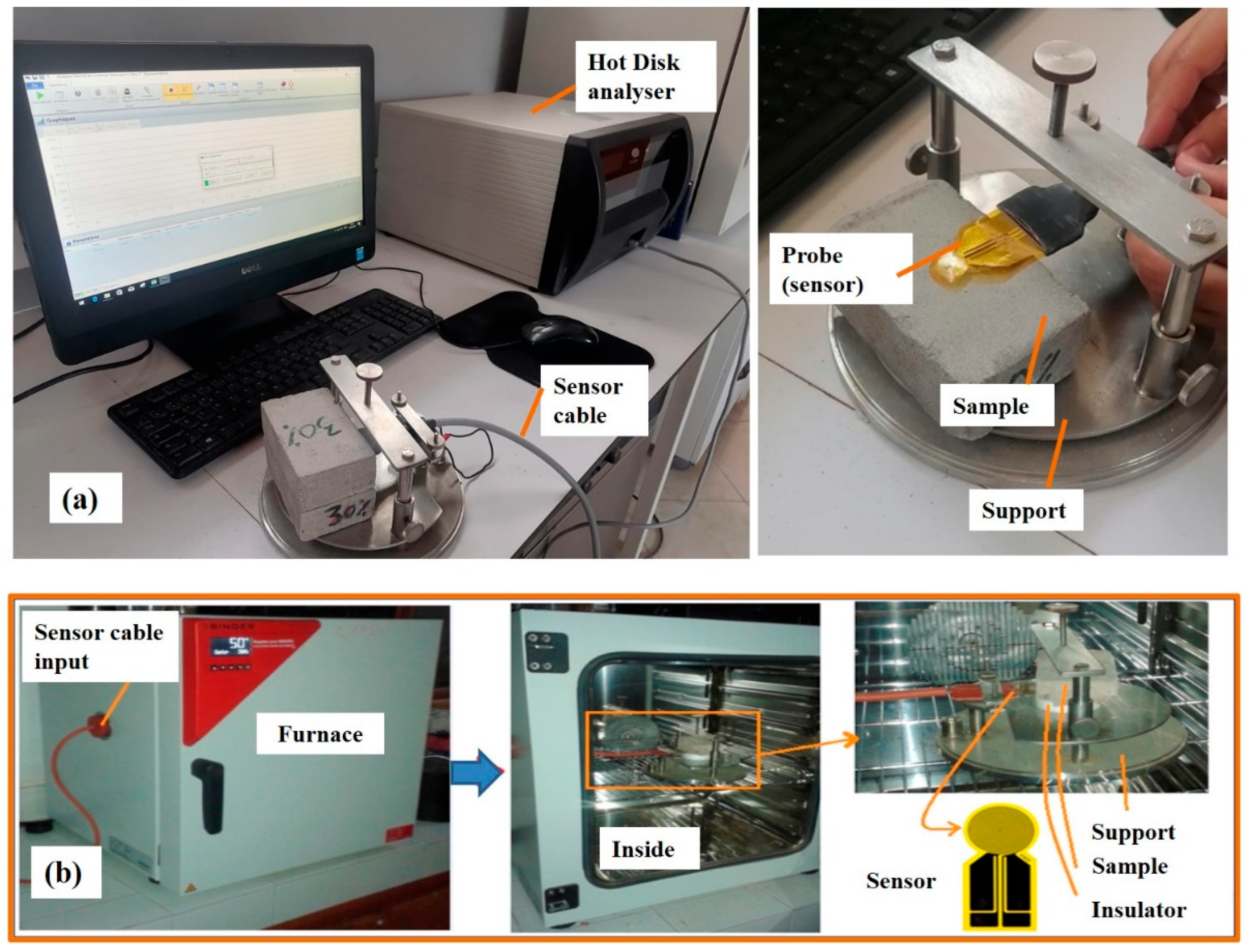 To assess thermal properties at different temperatures (30, 40, and 50  °C), a furnace connected to the Hot Disk device was used (see Figure 3b). Prior to each measurement, the sample was heated in the furnace for about 30 min to ensure temperature stabilization.