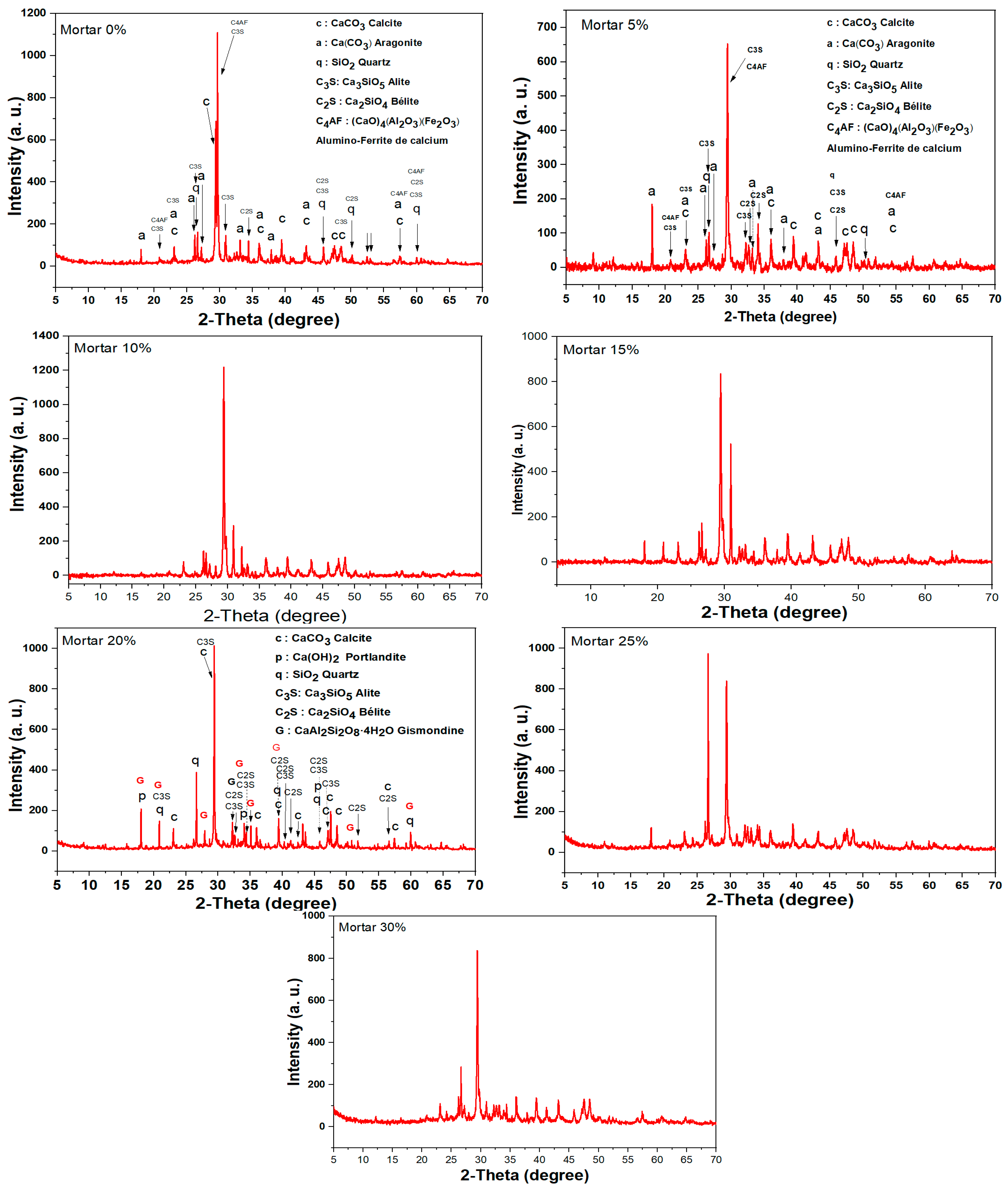 Figure 6. XRD patterns of mortars 0%, 5%, 10%, 15%, 20%, 25%, and 30%.