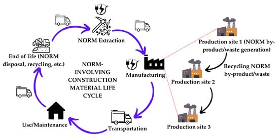 Life cycle of a construction material incorporating naturally occurring radioactive material (NORM).