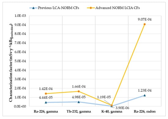 Comparison of the novel NORM LCIA characterisation factors (CFs) for the use-stage exposure with the previous LCA-NORM values on the same basis (mSv·y−1·kBq−1embedded in construction material).