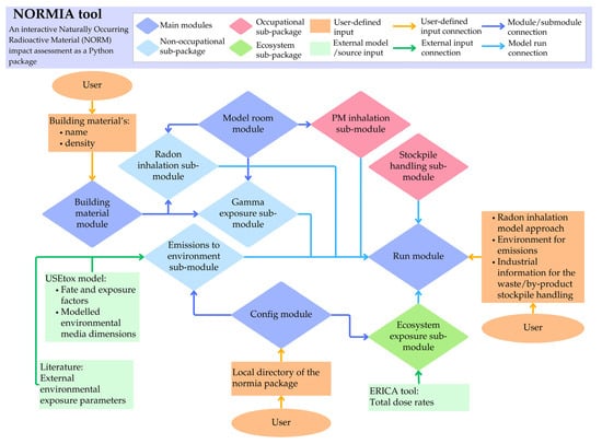 The main modules were created to introduce the common parameters to other modules/sub-modules and perform the calculations all at once in the same place to print out the characterisation factors. External data sources are also defined in this layer, for example, the USEtox model and the ERICA tool outputs are stored in the relevant Excel files. In addition to these Excel files, user-defined inputs are also collected in the “inputs.xlsx” Excel file so that the construction material-specific parameters are introduced to the package. The sub-packages reflect the organisation of the main impact categories under the NORM LCIA methodology, which are the non-occupational human health, occupational human health and the ecosystem components. Thus, there are three sub-packages relevant to each impact category. Within these three sub-packages, either one sub-module or multiple sub-modules are located. Each sub-module represents an exposure pathway shown in Figure 4 and has the relevant functionality with the corresponding equations either defined as a class object consisting of several functions or individual function(s) written in Python, involving the corresponding constants. The equations inside these Python objects are summarised in Section 3.1 and Section 3.2 of this paper. The installation steps and the elaborated description of NORMIA are given in Supplementary Material SA.