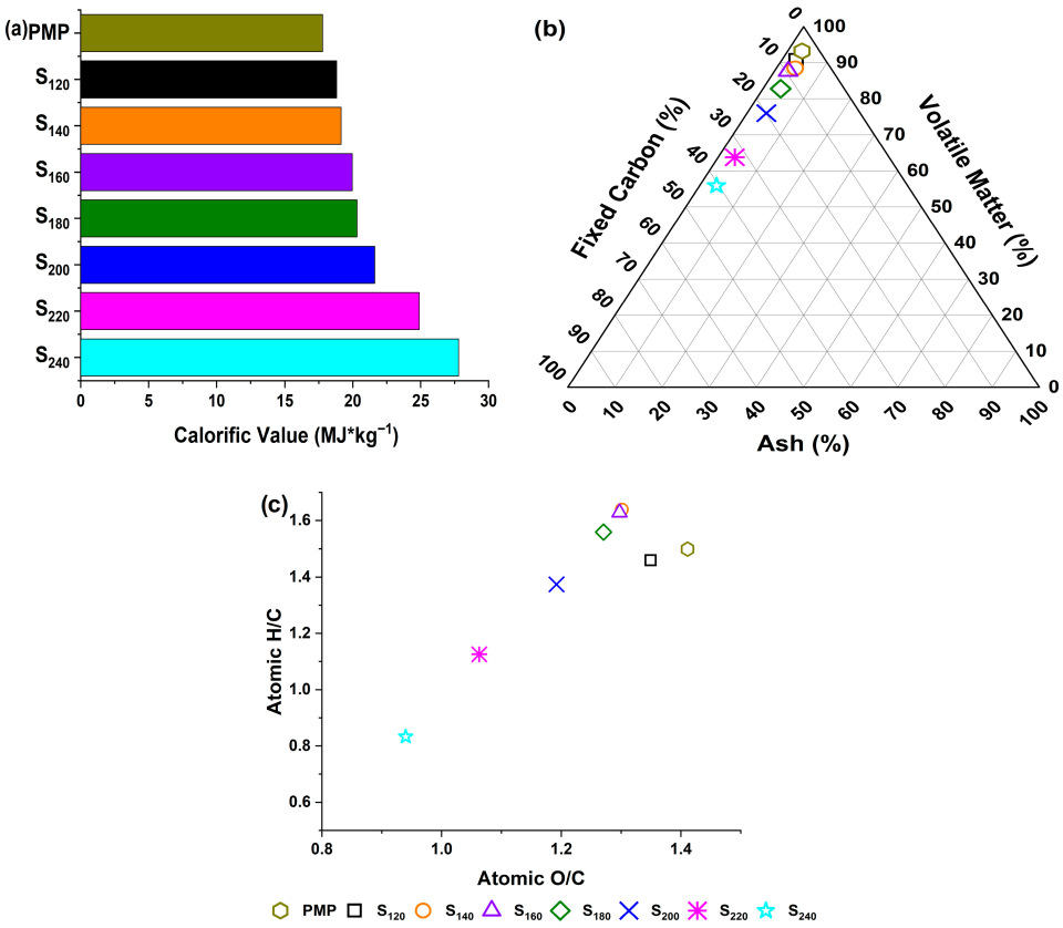 2.3. Effect of Pretreatment on Calorific Value, Proximal and Ultimate Characteristics