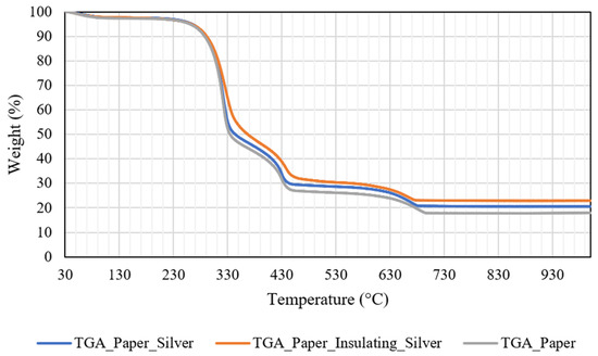 TGA spectra of PE device, analysis made on 3 different zones (paper alone, paper with silver, and paper with silver and insulation material).