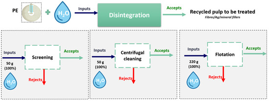 After the disintegration of the PE by the action of both water and mechanical mixing in the pulper, the pulp containing both the individualized fibers and the detached contaminants is sent to the screening, to the centrifugal cleaning, or to the flotation cell to separate the fibers and the silver. After the separation step, two fractions are obtained: