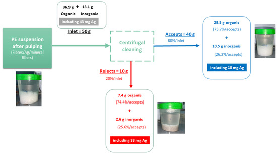 The centrifugal cleaning conditions have also been chosen according to the literature and previous results of our research team [42]. The main process parameter, the solid concentration, has been fixed at 0.5% (expressed again in dry matter content) to favor the sedimentation of dense particles such as silver. Beyond this value, the efficiency of density separation is minimal. The centrifugal cleaning separation rate is quite fast, and generally, a few minutes are sufficient to separate the dense elements from the fibers. The PE pulp quantity introduced at the entrance of the cleaner was again 50 g (counted in dry matter content).
