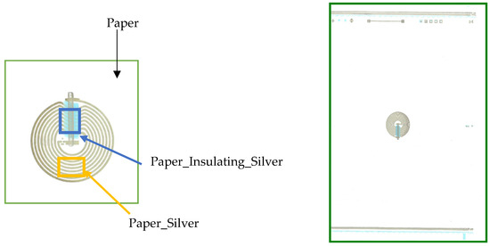 An industrial roll of XD80 paper free of charge, industrially printed with an RFID antenna, has been provided by Fedrigoni (https://specialpapers.fedrigoni.com, accessed on 14 September 2024). The antennas were printed using the flexographic printing technology with a silver-based functional ink. The pattern of the antenna is shown in Figure 6. The amount of ink (silver particles) deposited per antenna was estimated to be approximately 5 mg ± 0.1, as determined from the analysis of the silver content in the printed electronic device according to the method developed by Conceição et al. [21]. The composition of this printed electronic device has been further characterized (Section 2.1).