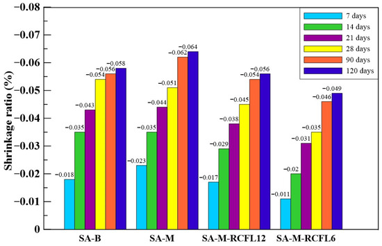 The shrinkage behavior of the benchmark concrete and MBOF concrete incorporating RCF was evaluated over a 120-day period, with measurement intervals at 7, 14, 21, 28, 90, and 120 days, as shown in Figure 1. The shrinkage ratio exhibited a progressive increase with time, displaying a proportional relationship with the number of curing days.