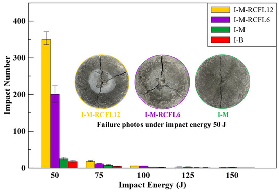 The MBOF concrete specimens incorporating RCF demonstrated significantly enhanced impact resistance compared to the benchmark specimen. At an impact energy of 50 J, the I-M-RCFL6 specimen sustained an average of 200 impacts before failure, whereas the I-M-RCFL12 specimen endured up to 351 impacts. The I-M-RCFL12 specimen exhibited the highest resistance among all tested groups.