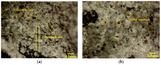 Optical microscopic images showing the fiber pull-out and fiber fracture failures of MBOF concrete specimens with 6 mm and 12 mm RCF after impact testing: (a) Specimen I-M-RCFL6, and (b) Specimen I-M-RCFL12.