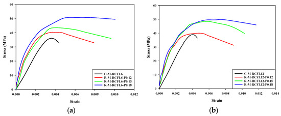 Stress–strain curves of MBOF concrete specimens incorporating 6 mm and 12 mm RCF under different gas pressures in the SRSHPB test: (a) 6 mm fiber, and (b) 12 mm fiber.