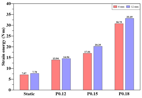 Strain energy refers to the deformation energy absorbed by a specimen during impact loading, and it is quantified as the area under the stress–strain curve up to the point of maximum stress. Figure 5 presents a bar chart illustrating the strain energy of MBOF concrete specimens reinforced with 6 mm and 12 mm RCF under varying gas pressures in the SRSHPB test. The results indicate that specimens incorporating 12 mm RCF exhibited higher strain energy absorption compared to those incorporating 6 mm RCF, suggesting improved impact resistance with longer fiber length.