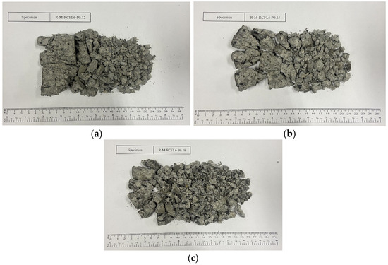 Failure photographs of M-RCFL6 specimens under different gas pressures in the SRSHPB test: (a) Gas pressure 0.12 MPa, (b) Gas pressure 0.15 MPa, and (c) Gas pressure 0.18 MPa.