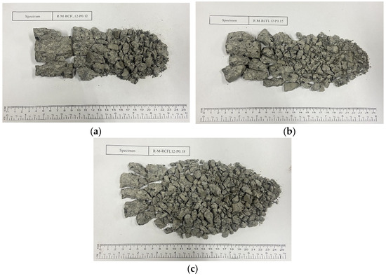 Failure photographs of M-RCFL12 specimens under different gas pressures in the SRSHPB test: (a) Gas pressure 0.12 MPa, (b) Gas pressure 0.15 MPa, and (c) Gas pressure 0.18 MPa.