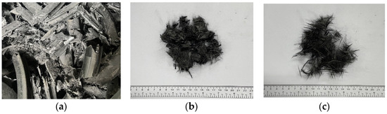 Recycled carbon fiber obtained from CFRP bicycle wheel rims using MAP technology: (a) CFRP waste from bicycle wheel rims, (b) 12 mm carbon fibers after the microwave-assisted pyrolysis process, and (c) 12 mm carbon fibers after the pneumatic dispersion process.