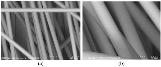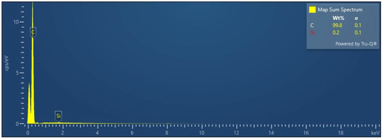 Scanning electron microscopy (SEM) (Hitachi High-Tech Corp., Tokyo, Japan) was used to observe the surface morphology of the MAP-treated RCF. Figure 9a,b show the SEM images at different magnifications, revealing a clean fiber surface without residual epoxy resin. The elemental composition of the RCF was analyzed using energy-dispersive X-ray spectroscopy (EDS) shown in Figure 10. The results indicate a high carbon purity of 99.8%, confirming effective removal of matrix material during the MAP process.