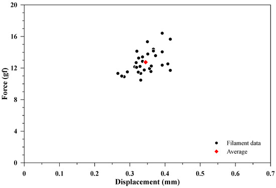To evaluate the mechanical properties of the recovered RCF, single-filament tensile tests were conducted in accordance with ASTM D3822-07 [51]. Thirty individual RCF filaments were tested, and the average tensile force and displacement were determined to be 12.74 ± 1.40 gf and 0.345 ± 0.07 mm, respectively. The failure force–displacement relationship is illustrated in Figure 11.