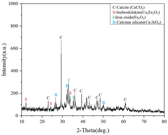 The chemical composition of MBOF was analyzed using X-ray fluorescence (XRF), which indicated that the primary components were calcium, iron, and silicon oxides (Table 6). The crystalline phases of MBOF were identified using X-ray diffraction (XRD), with the results shown in Figure 14. The diffraction peaks confirmed the presence of Ca, Fe, and Si oxides as major crystalline phases.