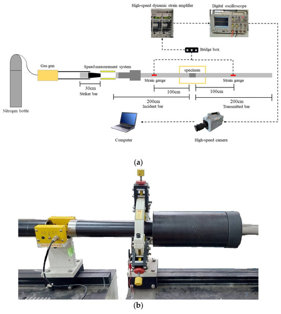 To address this limitation, a stress-reversal SHPB (SRSHPB) technique was adopted, based on the design proposed by [63]. The stress reversal technique was employed to prevent multiple stress wave transmissions within the specimen. In the RSHPB system, only the initial stress wave is allowed to propagate through the specimen, ensuring that failure occurs under a single loading event. Specifically, when the striker bar produces a compressive stress wave in the incident bar, the reaction mass generates a tensile stress wave that detaches the incident bar from the specimen, thereby eliminating repeated loading caused by reflected waves. As a result, the SRSHPB system provides a more accurate representation of specimen failure under dynamic loading. Figure 15a,b show the experimental setup of the SRSHPB system and the stress reversal mechanism, respectively.