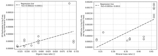 This reciprocal behaviour also helps to validate the output-side indicators. Both EP-freshwater ( = 0.28, = 5.8, p = 0.029) and GWP-luluc ( = 0.46, = 12.6, p = 0.003) display values comparable to those of the models in Table 5, but with inverse predictive tendencies, likely reflecting the direct substitution of organic materials. The second of these models is visualised in Figure 1 (right), which illustrates the individual data points along with the regression line. The GWP-luluc values are distributed consistently across the different proportions of mineral content, forming two small clusters at 0.365 and 0.46, corresponding to datasets from PTM and Danosa, respectively.