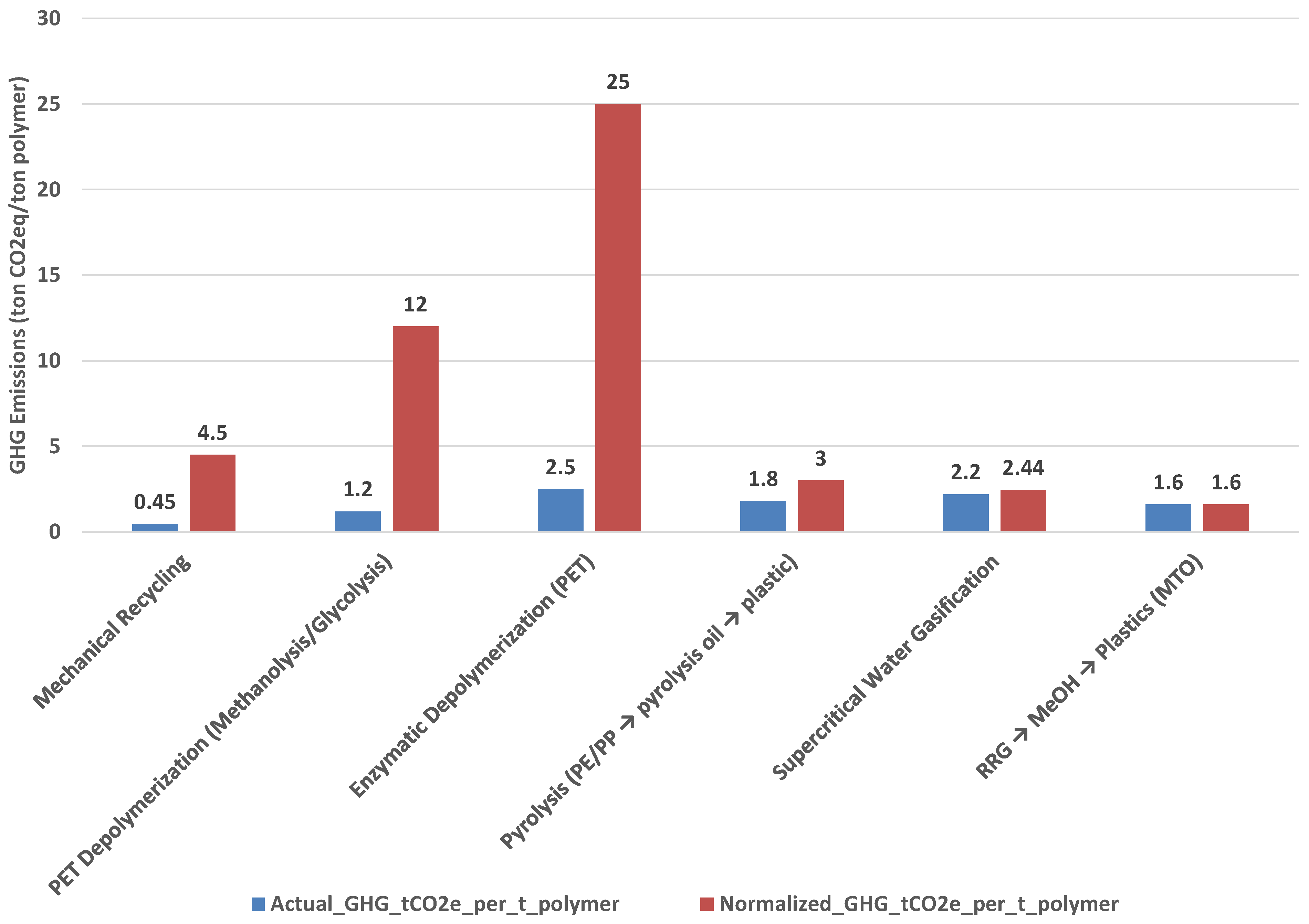 - System-level performance matters: Material-specific pathways (e.g., mechanical recycling, PET depolymerization) can exhibit low process intensities yet deliver high normalized impacts when limited eligibility forces the system to manage the remaining stream via higher-emitting or lower-value routes. In contrast, RRG maintains the lowest normalized GHG (~1.6 t CO2e per t polymer) because it accepts virtually all organics in MSW, converts them to syngas, and enables methanol-to-olefins for virgin-quality plastics while vitrifying inorganics.