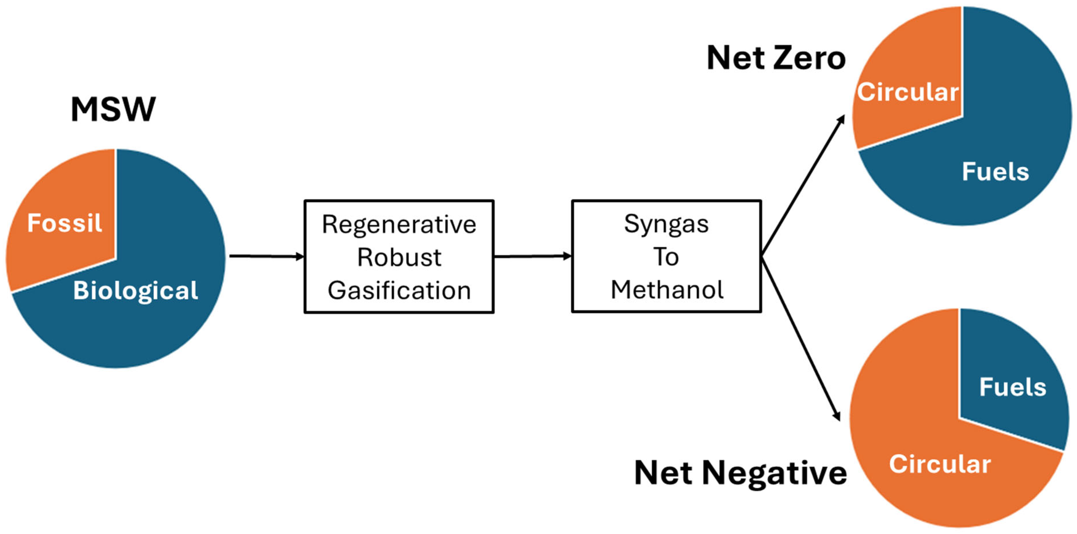 | RRG | Accepts all organics including mixed, dirty, and contaminated plastics | Syngas → Methanol | 1.6 | 100 | 1.6 |