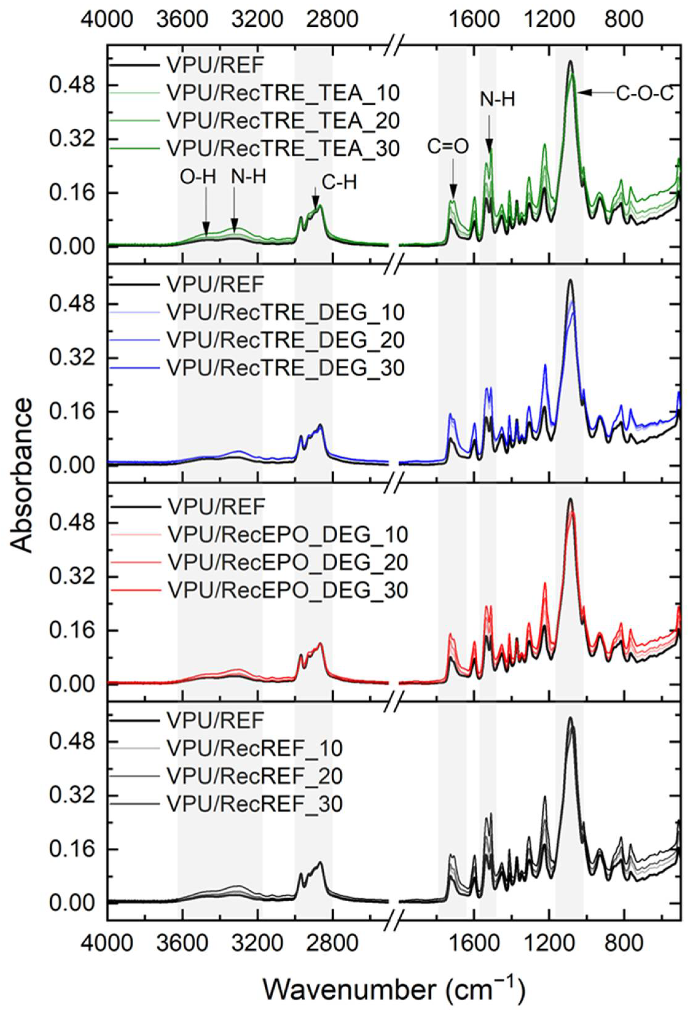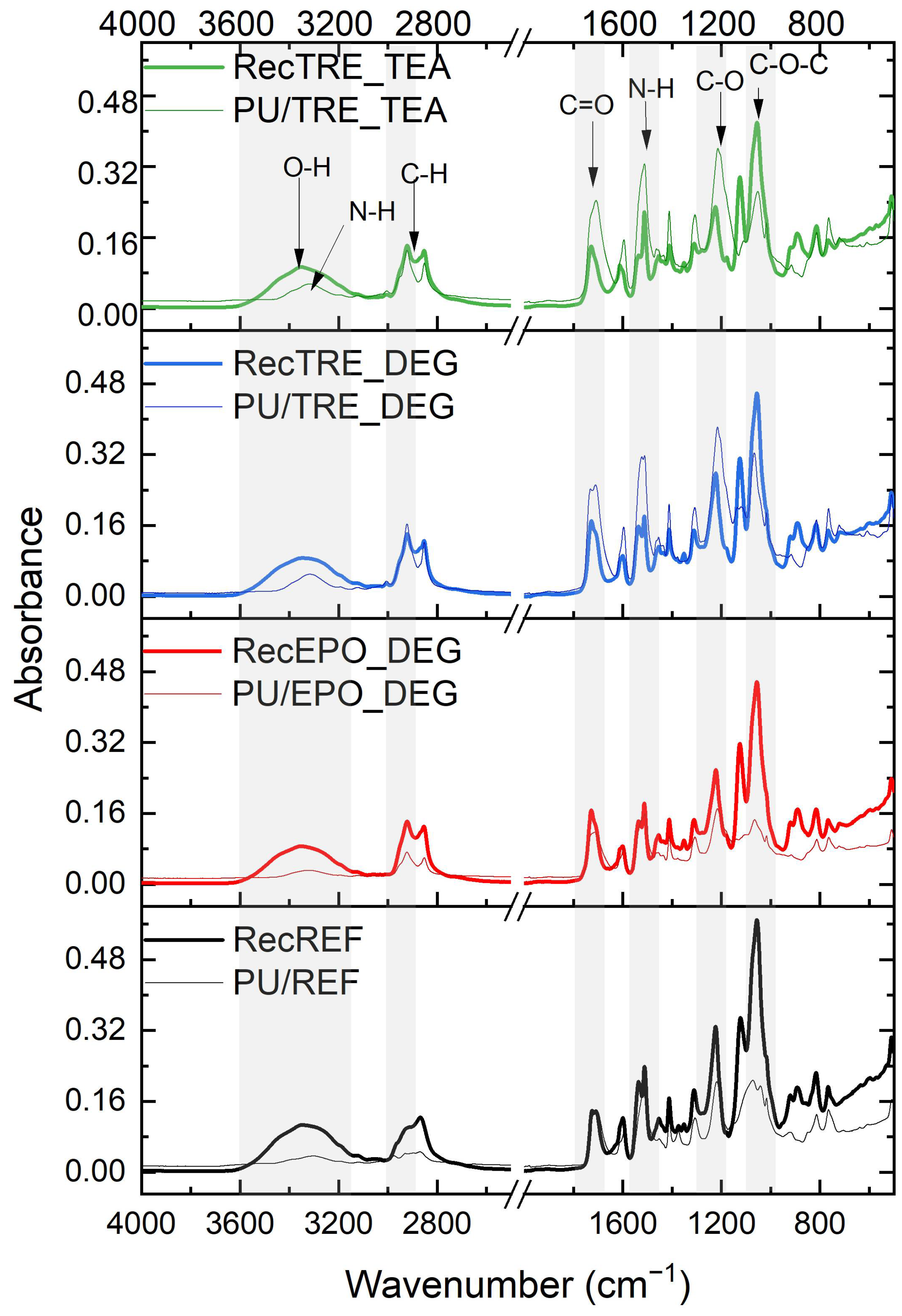 Figure 3). FTIR spectra of the polyurethane foams (PU/REF, PU/EPO_DEG, PU/TRE_DEG, PU/TRE_TEA) and their corresponding repolyols (RecREF, RecEPO_DEG, RecTRE_DEG, RecTRE_TEA) exhibit a similar set of characteristic absorption bands typical for polyurethane-based materials (