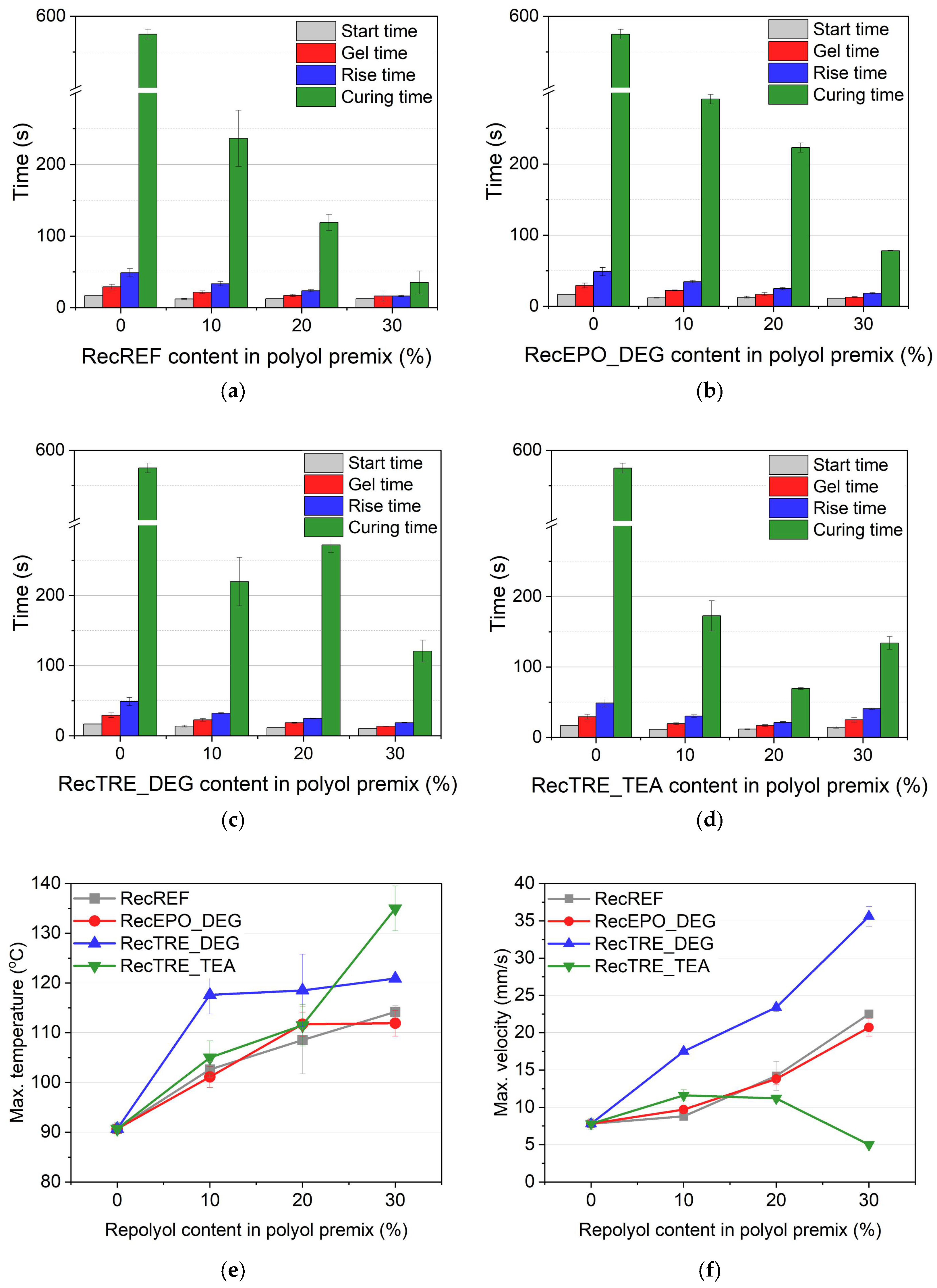 In addition, it was observed that with the increase in the content of repolyols in the polyol masterbatch, the foam growth rate and the maximum temperature inside the material increase. These observations indicate the autocatalytic effect of repolyols on the course of the foaming process and the formation of polyurethane. Again, the exception is the system with the RecTRE_TEA rebiopolyol, in which the amount of catalyst was reduced. The graphs presented in