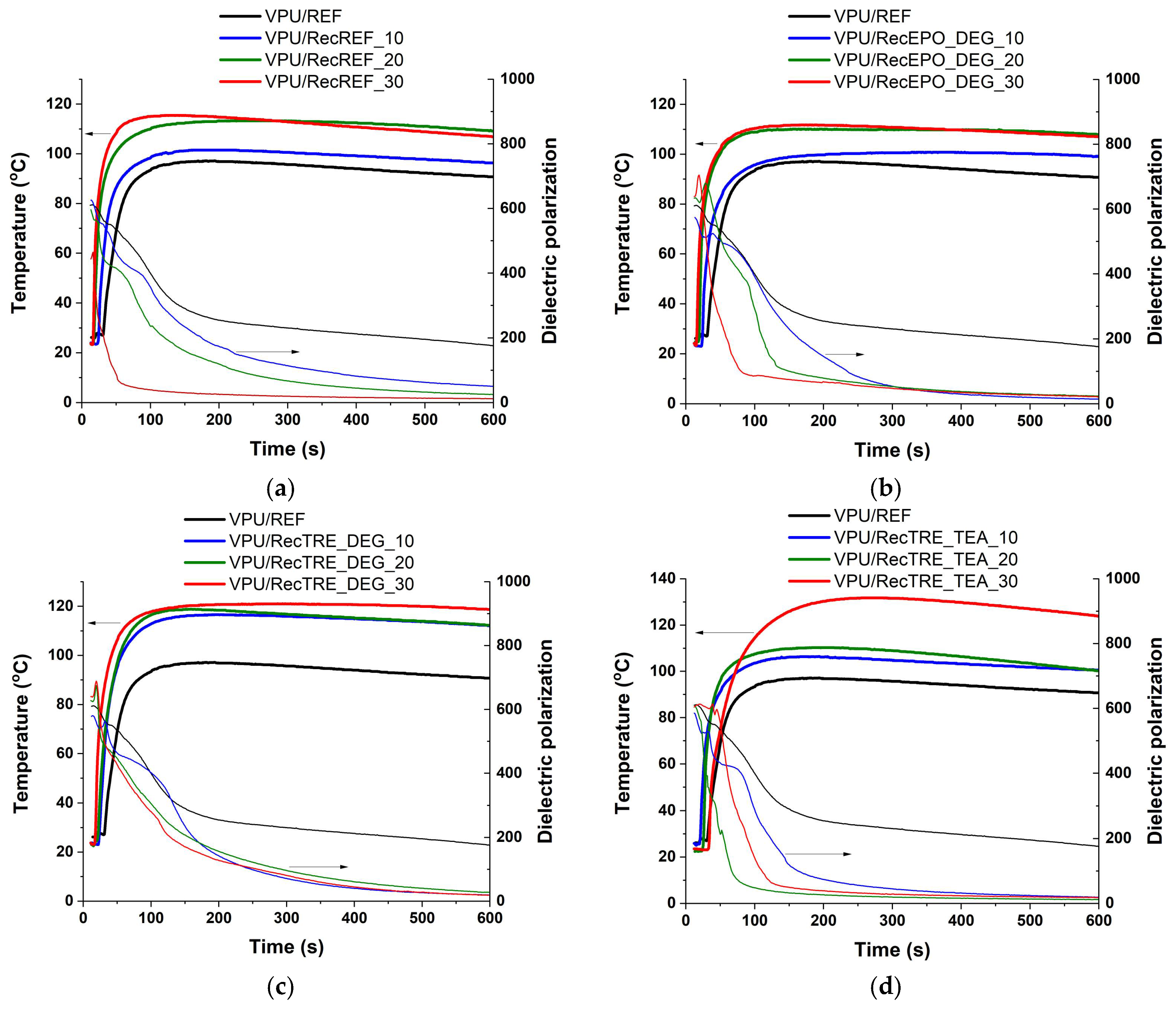 43]. The rapid approach to a value close to zero indicates that the reactions of forming polyurethane bonds and foaming reactions take place quickly. The presented graphs confirm the catalytic effect of repolyol, because both the temperature inside the foam is higher and the dielectric polarization value approaches zero faster in systems with a larger amount of repolyol. Kurańska obtained similar results when obtaining rigid polyurethane foams in which repolyol and rebiopolyols were used [