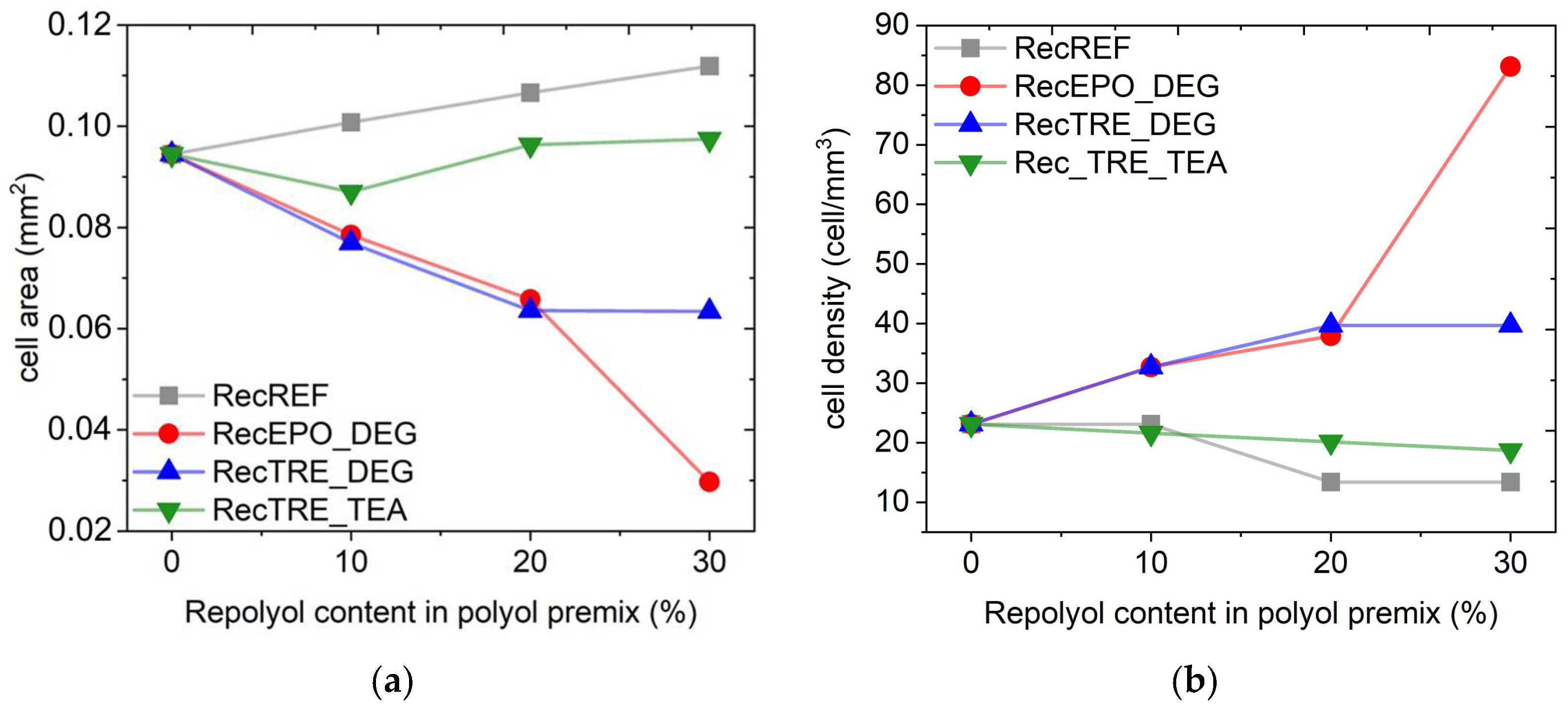 It was observed that adding a rebiopolyol derived from a petrochemical reference foam and a rebiopolyol derived from a foam obtained using the biopolyol TRE_TEA resulted in a slight increase in the surface area and a slight change in the density of the analysed cells. Using rebiopolyols derived from the chemolysis of foams obtained with the biopolyols EPO_DEG and TRE_DEG decreases the cell surface area and increases the cell density of the foam. This phenomenon may be due to these rebiopolys acting as surfactants. The addition of biopolyols to polyurethane foam systems often has a surfactant effect, reducing cell surface area [
