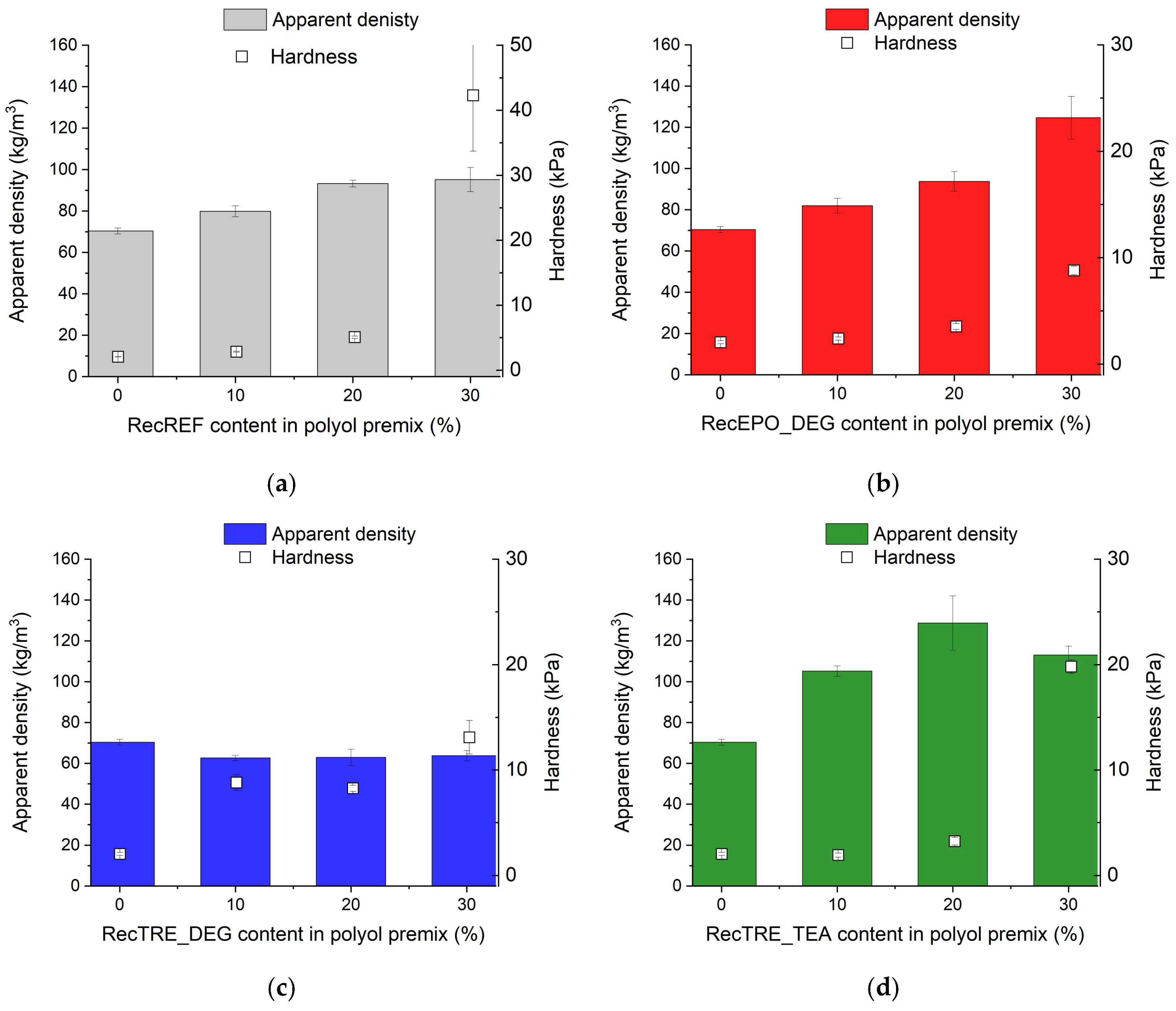 Figure 9). A deviation from the described relationship is characterized by VPU/RecTRE_DEG foams, whose apparent density is practically unchanged, regardless of the mass fraction of rebiopolyol and is approx. 70 kg/m