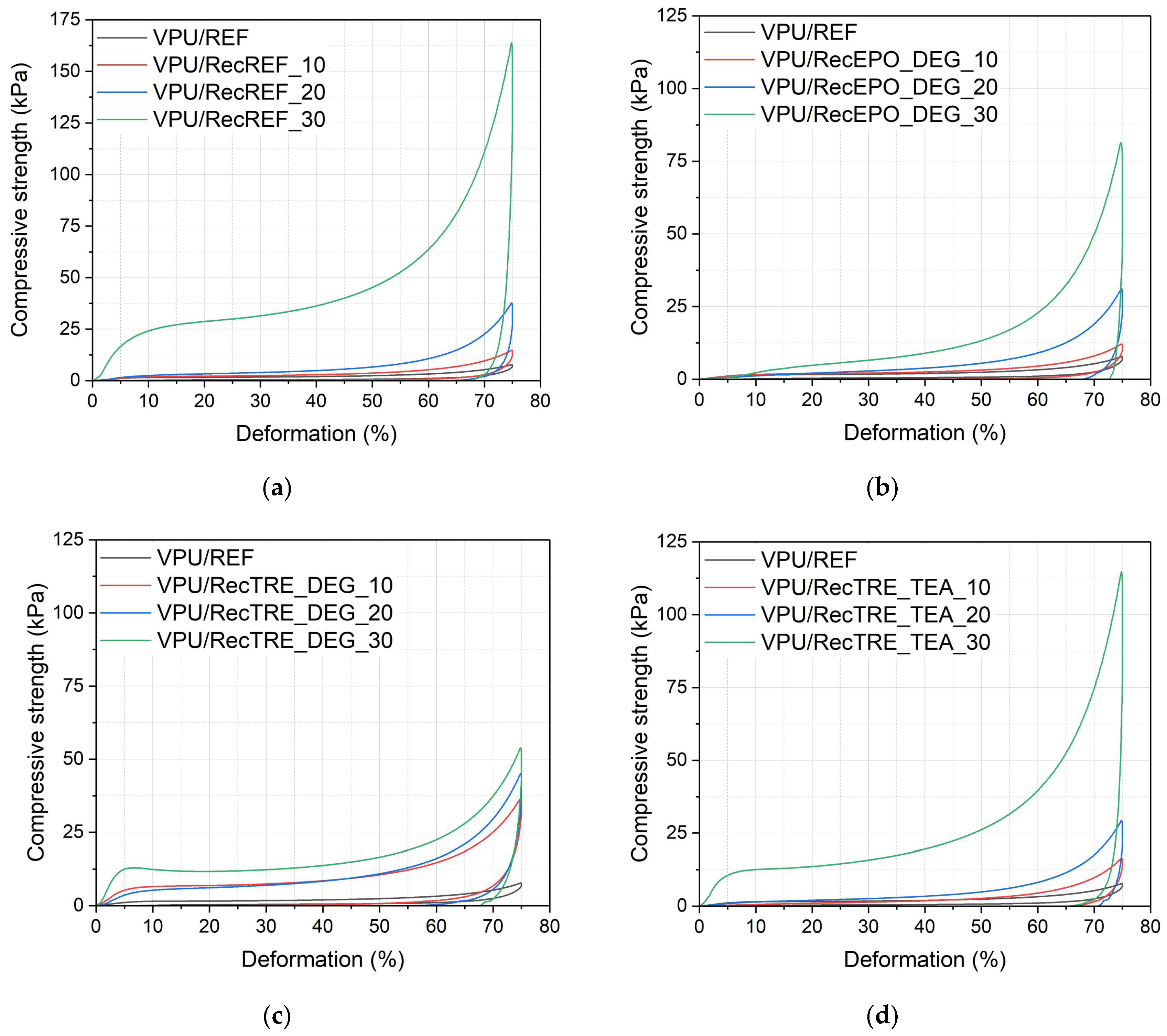Figure 6. It can be seen, for example, that the foams with the highest hardness required the highest force for their 75% deformation. For most of the foams tested, the hysteresis loop and properties such as hardness, comfort factor and hysteresis are calculated in accordance with the standard and determined at the fourth compression of the material. For materials containing 30% repolyol, i.e., VPU/RecREF_30, VPU/RecEPO_DEG_30, VPU/RecTRE_DEG_30 and VPU/RecTRE_TEA_30 the hysteresis loops were determined during the first compression, as the material was permanently deformed, thereby increasing the apparent density of the foam. Increasing the apparent density of the foam increases the compressive strength, so the results from the fourth deformation would not be representative.